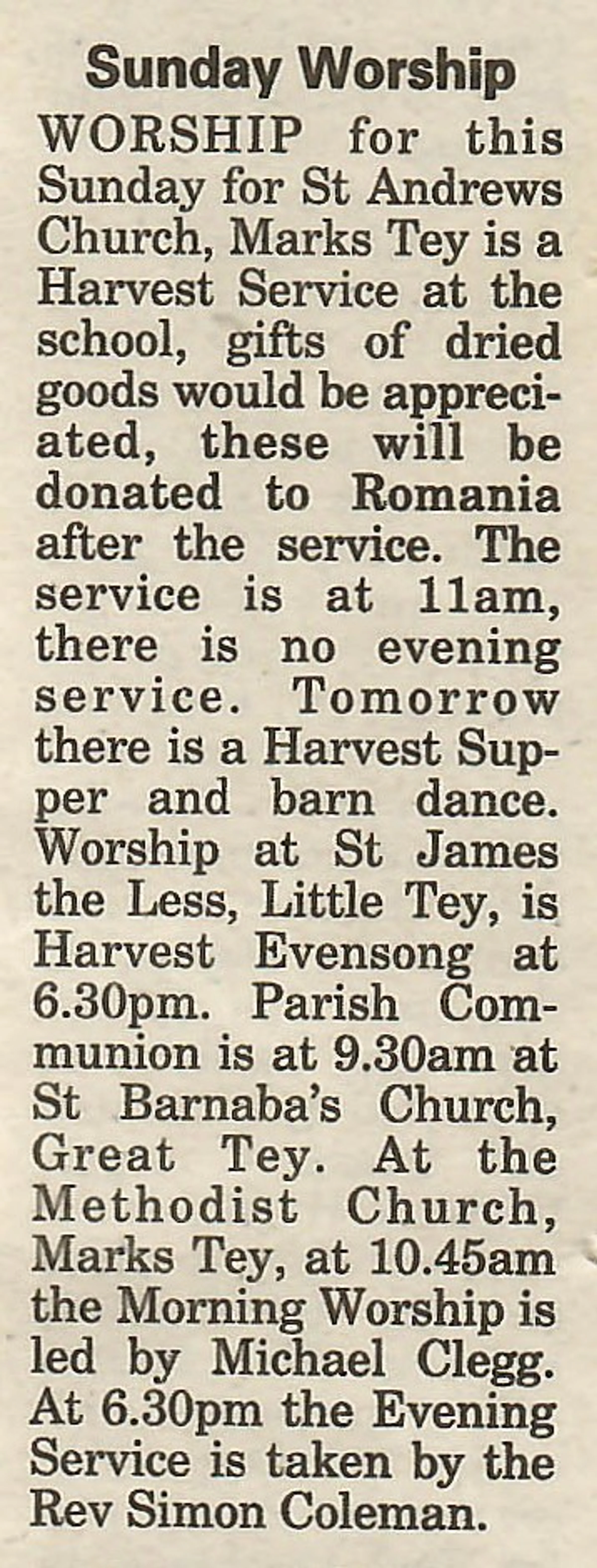 Village newspaper column reporting on church services.