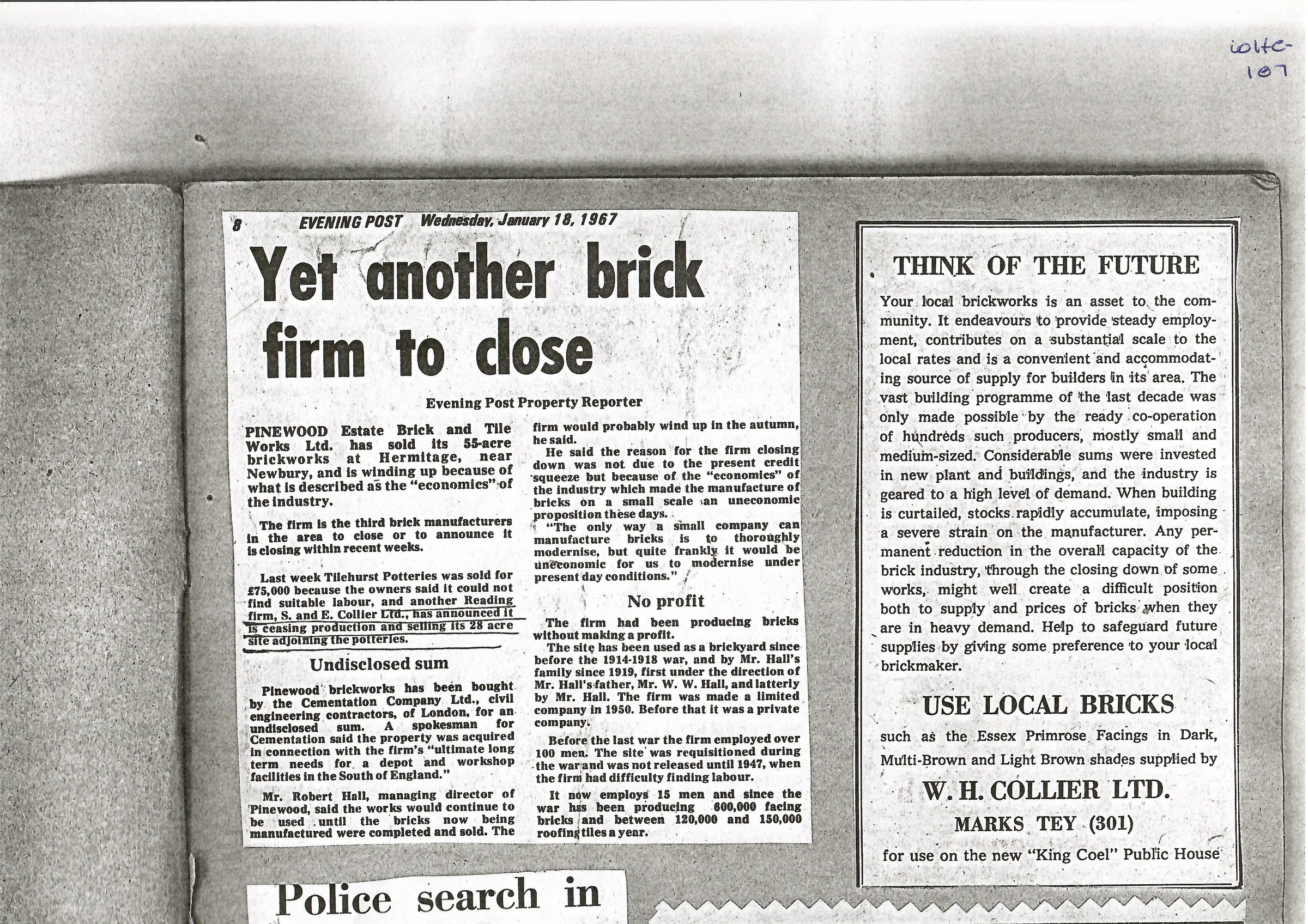 Newspaper cutting describing the closure of S and E Collier Brickworks as well as Pinewood Estate Brick and Tile Works Ltd.