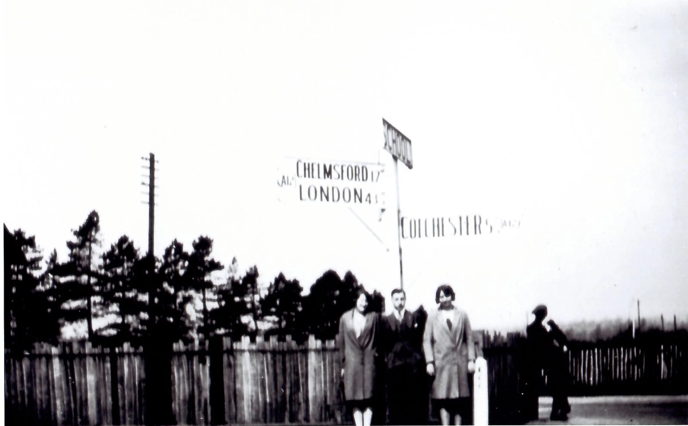 Three people are posing for this photo taken at the junction between London Road and Coggeshall Road. Another man is behind. The fence was surrounding the school playground.