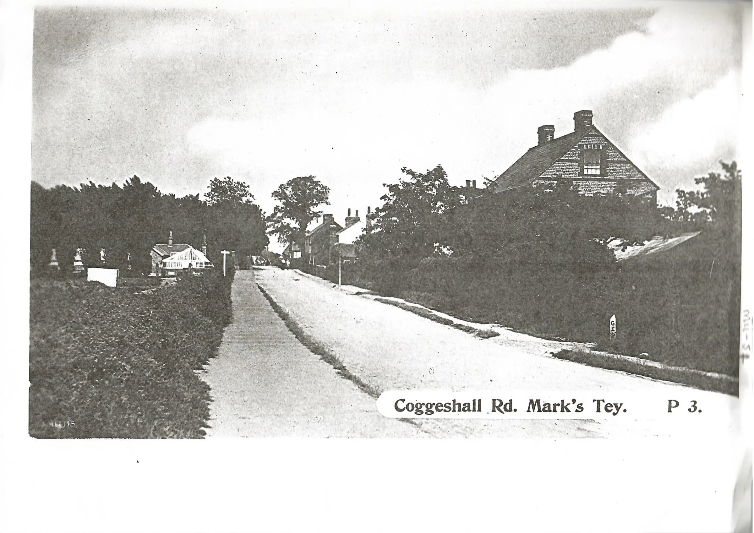 A postcard of a view looking down Coggeshall Road to where the roundabout now is. It looks like Bridge Farm on the right.
