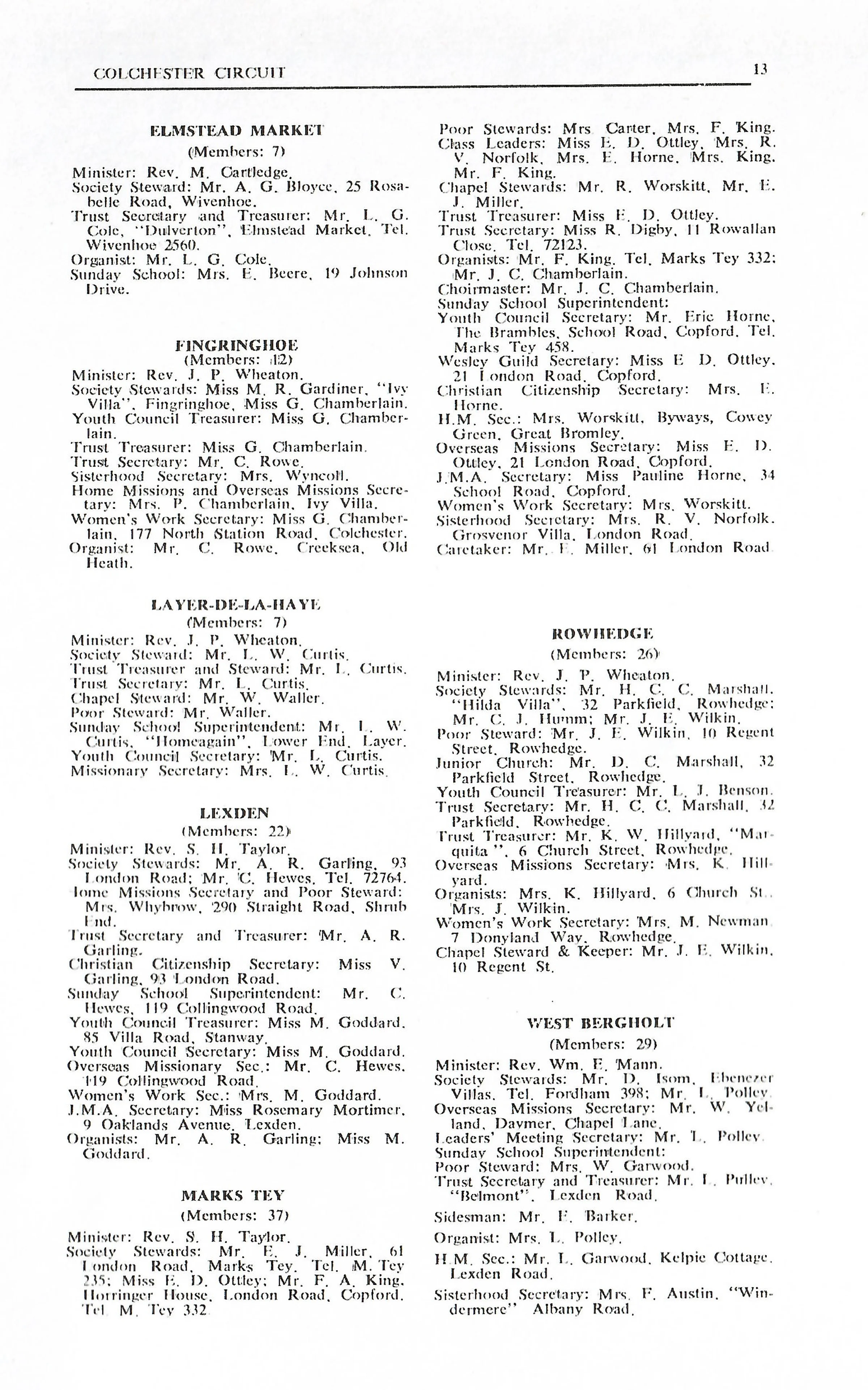 Page 13 of this directory has the section for Marks Tey with the name of the minister (Rev S H Taylor) and those with appointments with the church from the stewards to the caretaker.