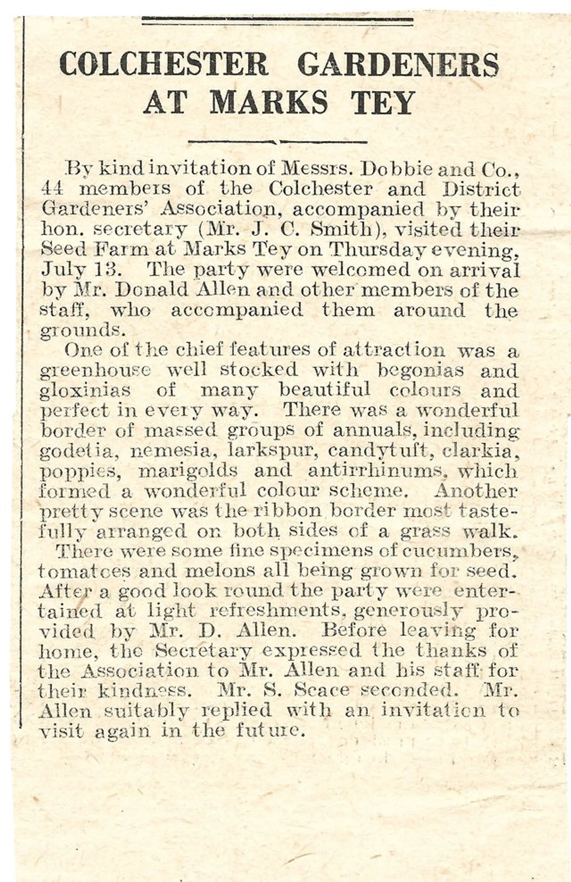 An undated account of a visit to Dobbies seed farm at Marks Tey by 44 members of the Colchester & District Gardeners' Association. Mr Donald Allan and others showed them around. They saw colourful flowers, cucumbers, tomatoes and melons and were given refreshments.