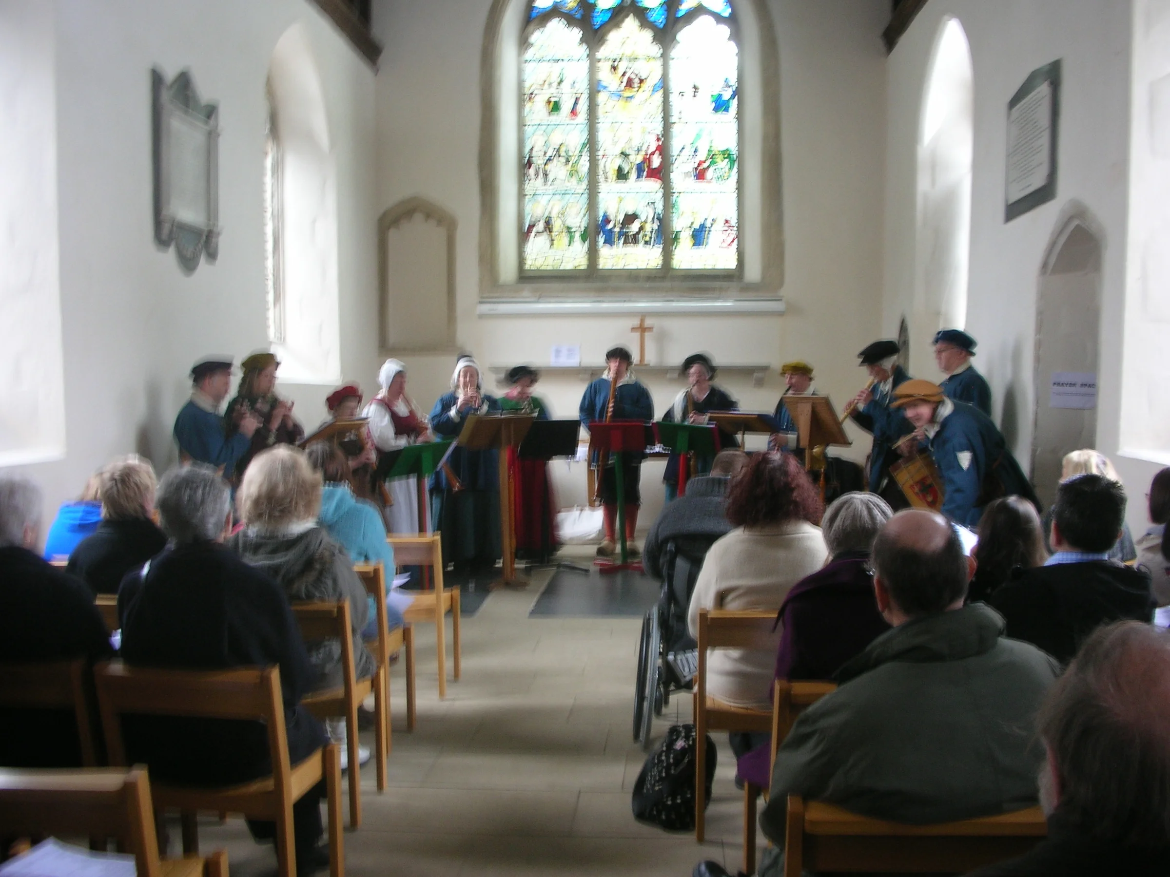Players in medieval or maybe Tudor costumes performing music in St Andrew's church on 24 March 2013.