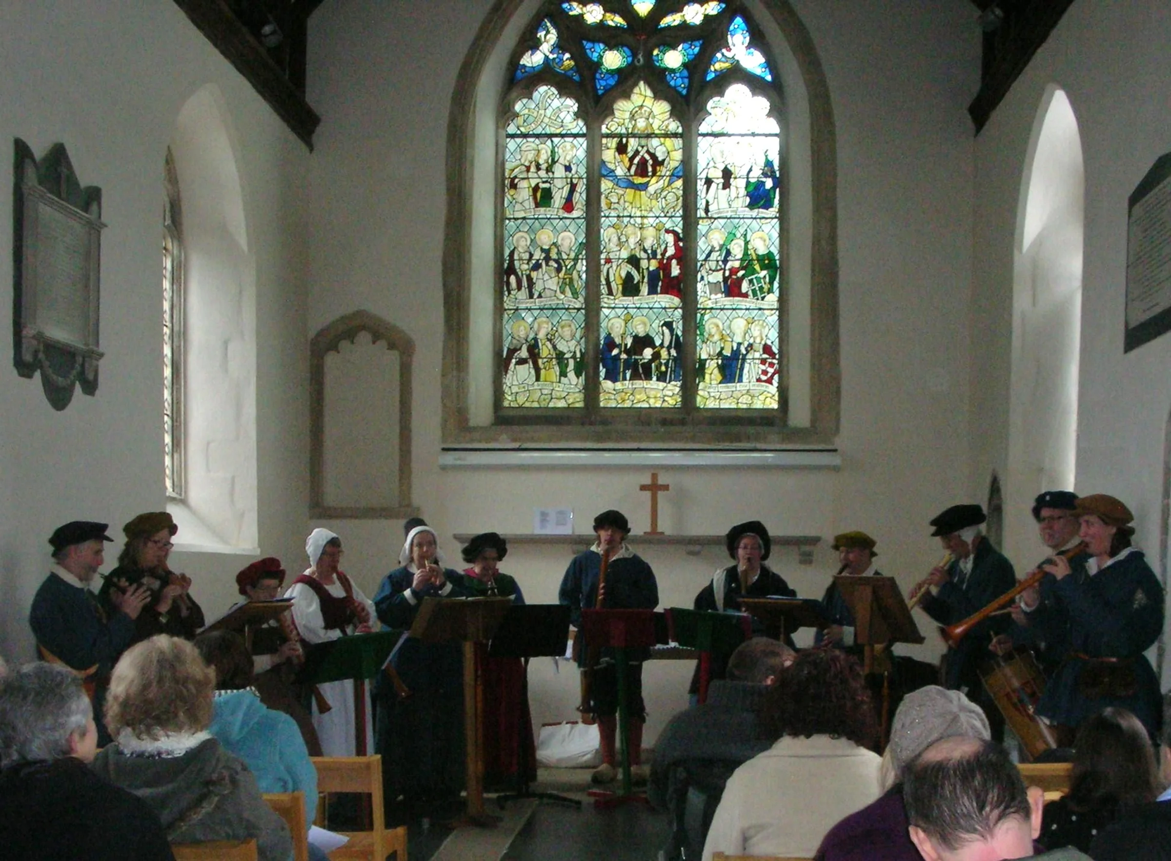 Players in medieval or maybe Tudor costumes performing music in St Andrew's church on 24 March 2013.