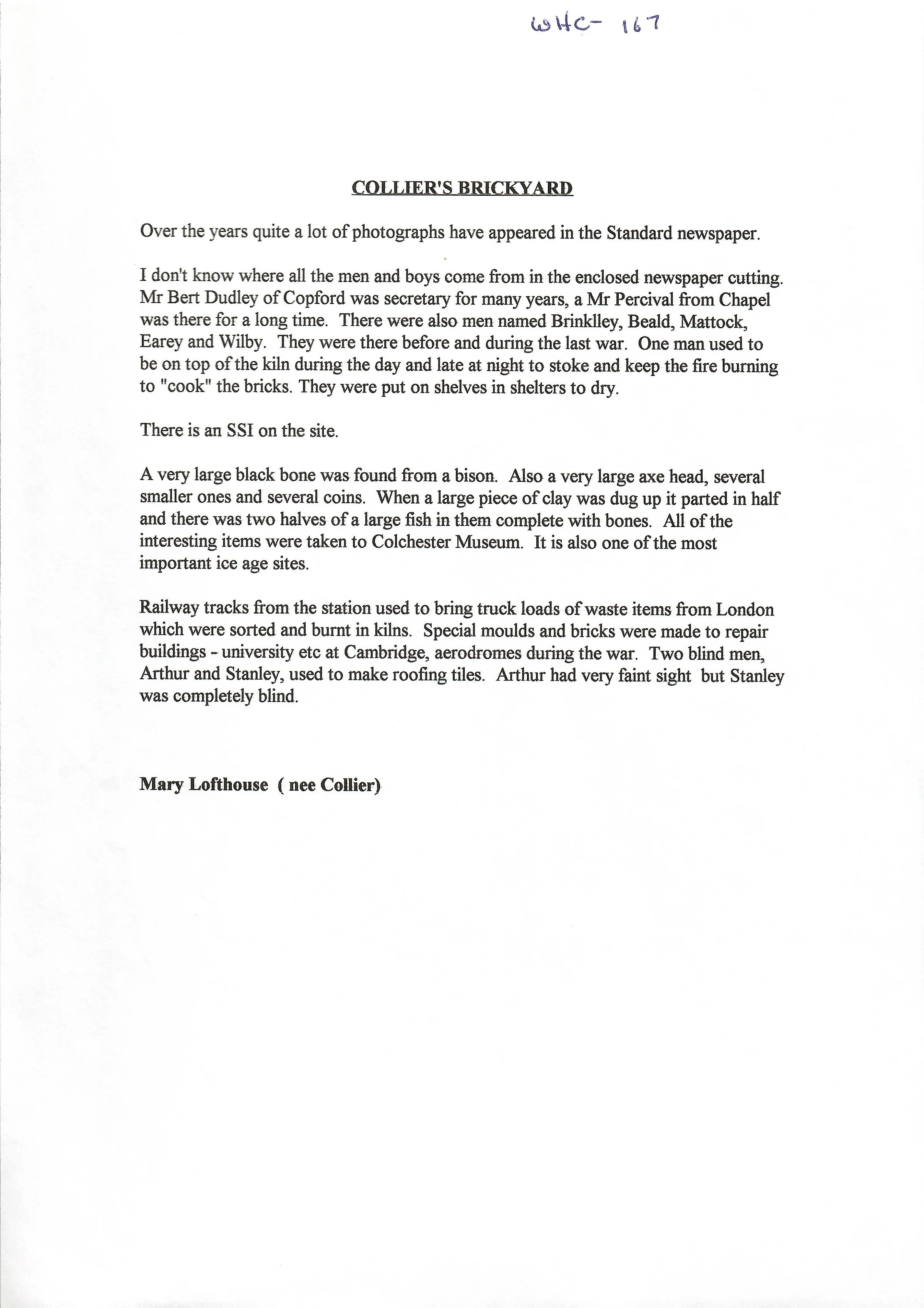 Recollections from Mary Lofthouse (nee Collier) about the brickworks.