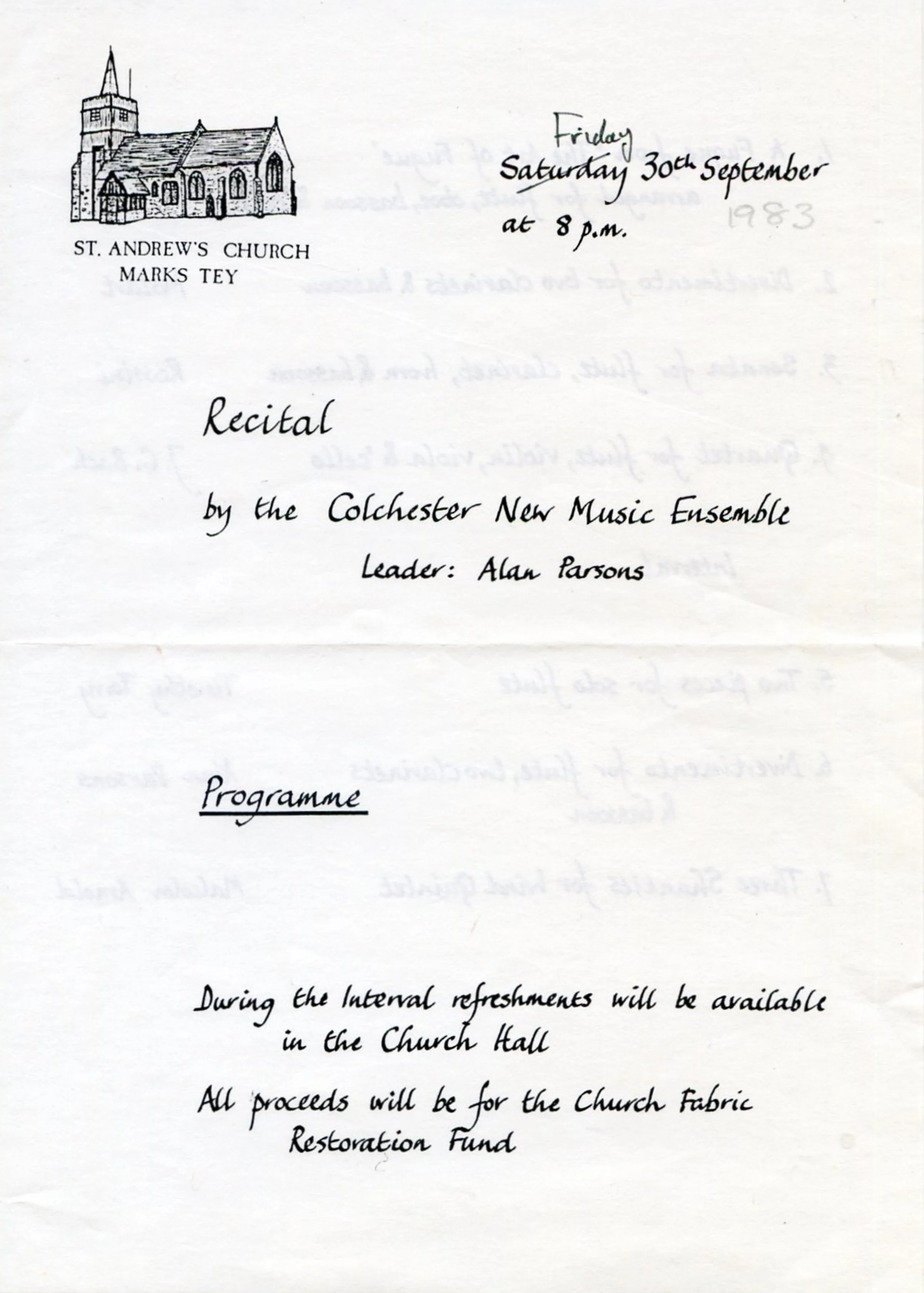 A concert programme and ticket for a performance by the New Music Ensemble on 30 September 1983.