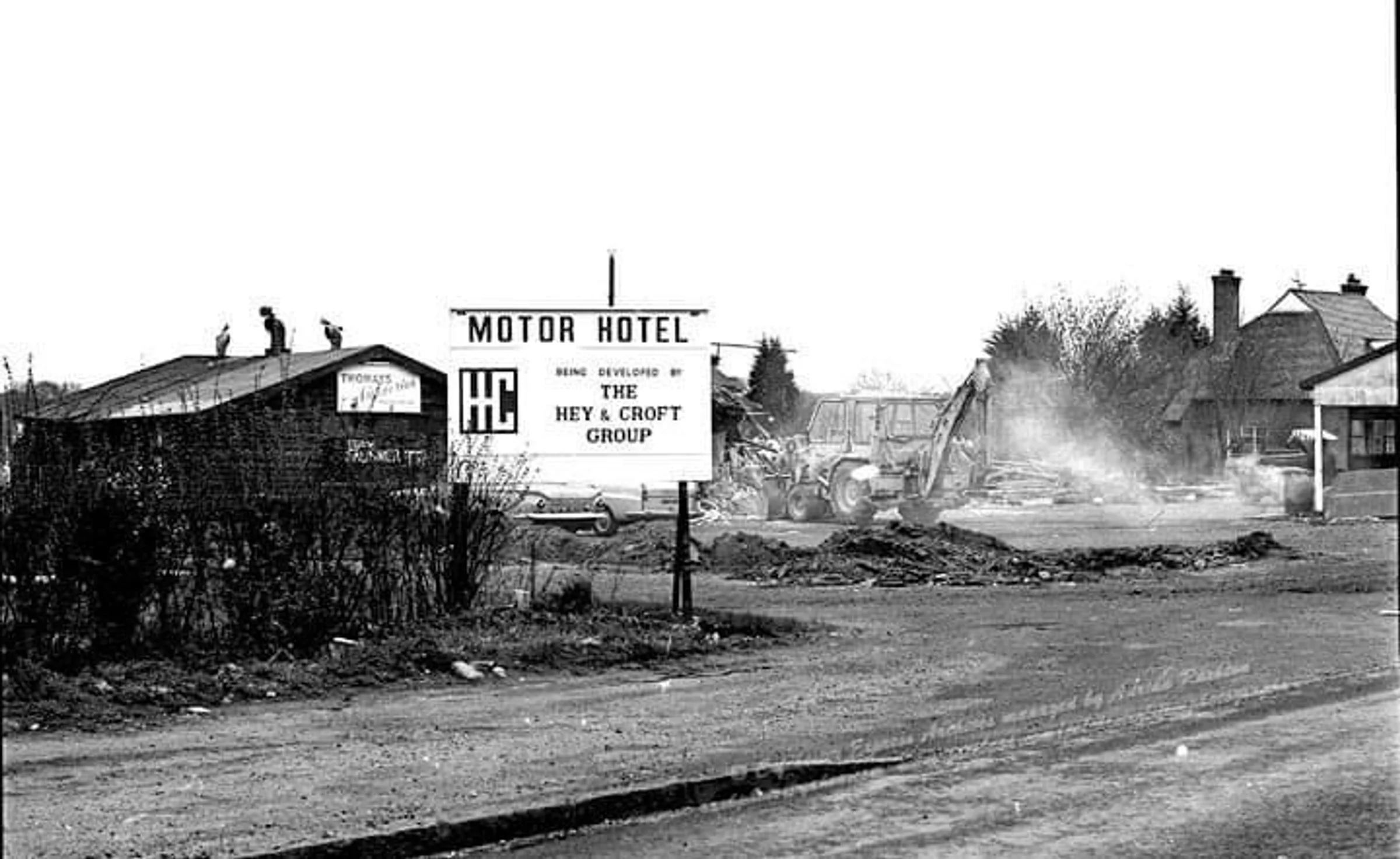 The sign says: MOTOR HOTEL, BEING DEVELOPED BY THE HEY & CROFT GROUP