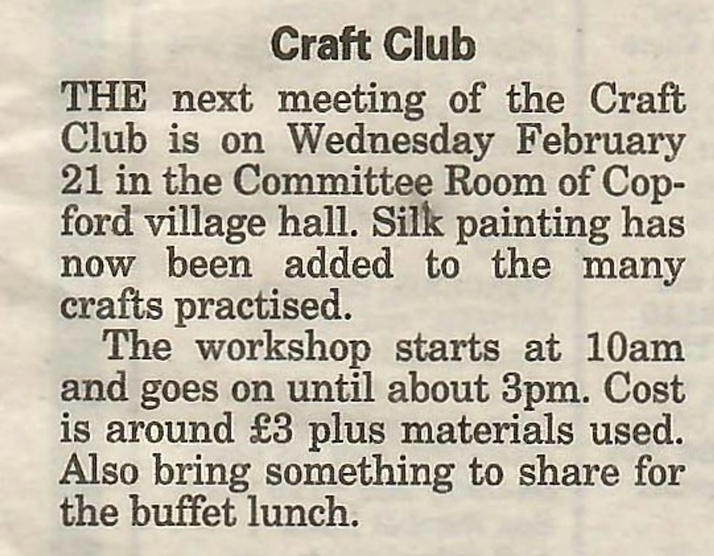 Village newspaper column reporting on the forthcoming meeting of the Craft Club.