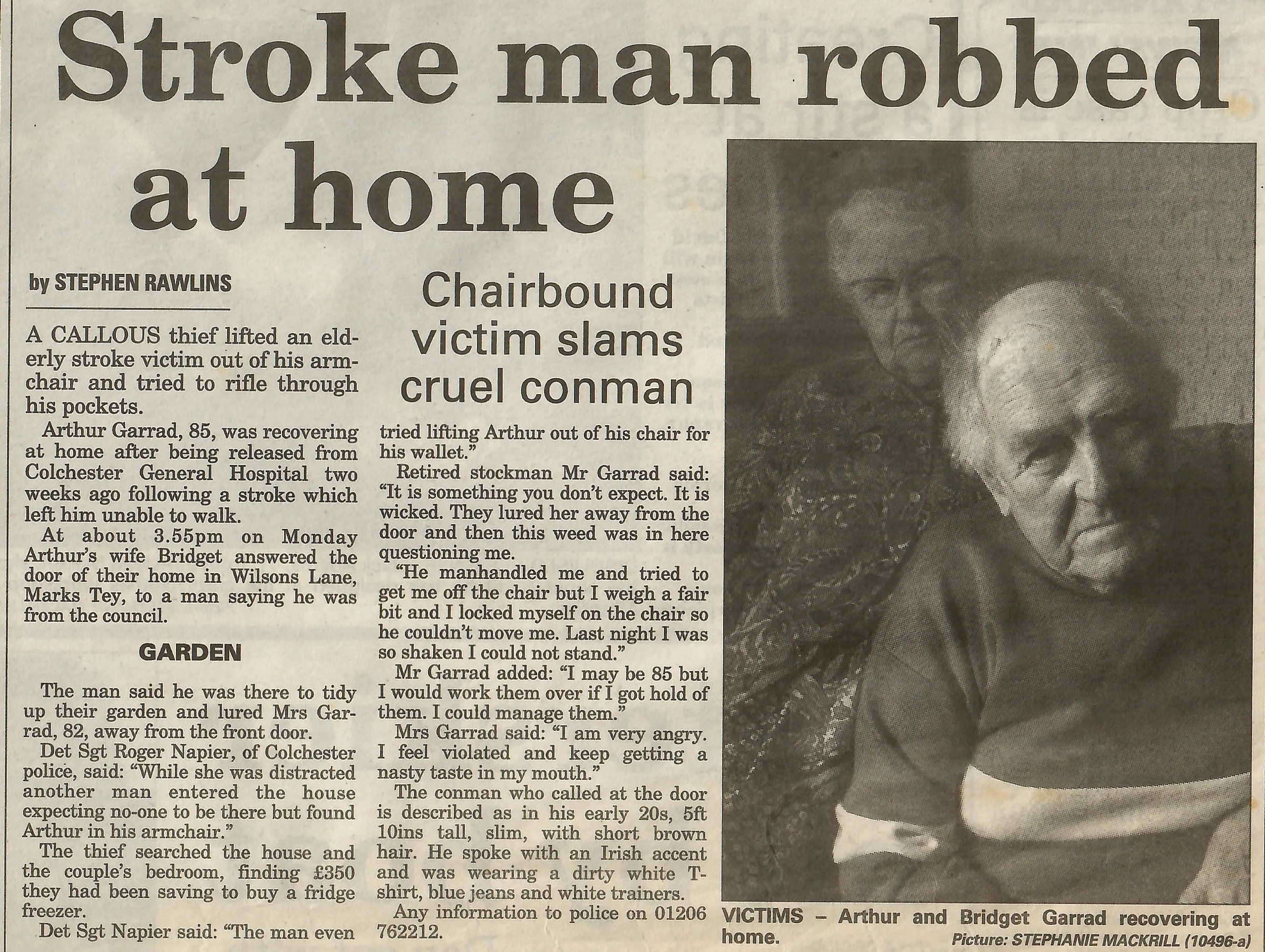 Newspaper photograph and report regarding the burglary of an elderly stroke victim.