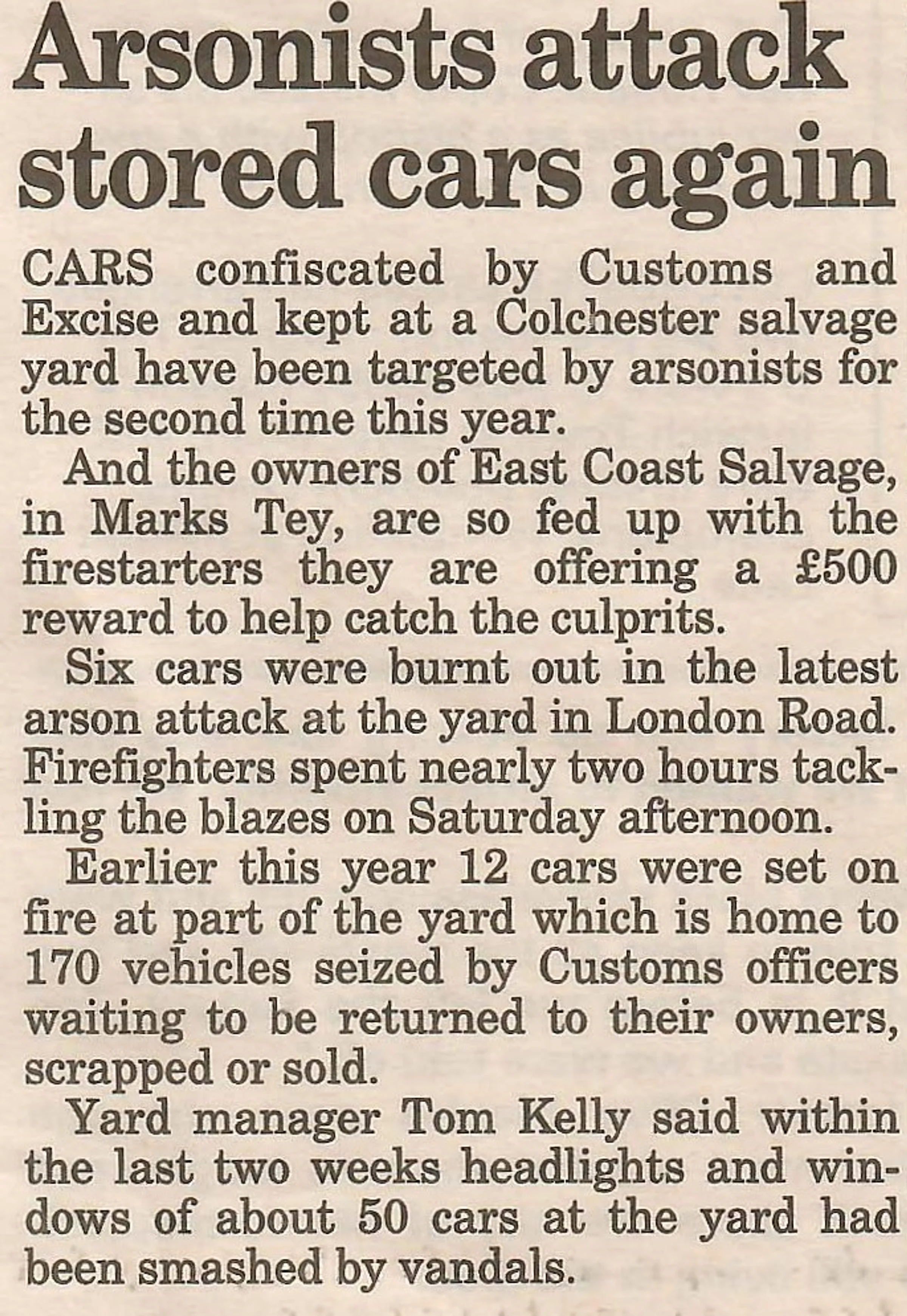 Newspaper report regarding an arson attack at East Coast Salvage yard.