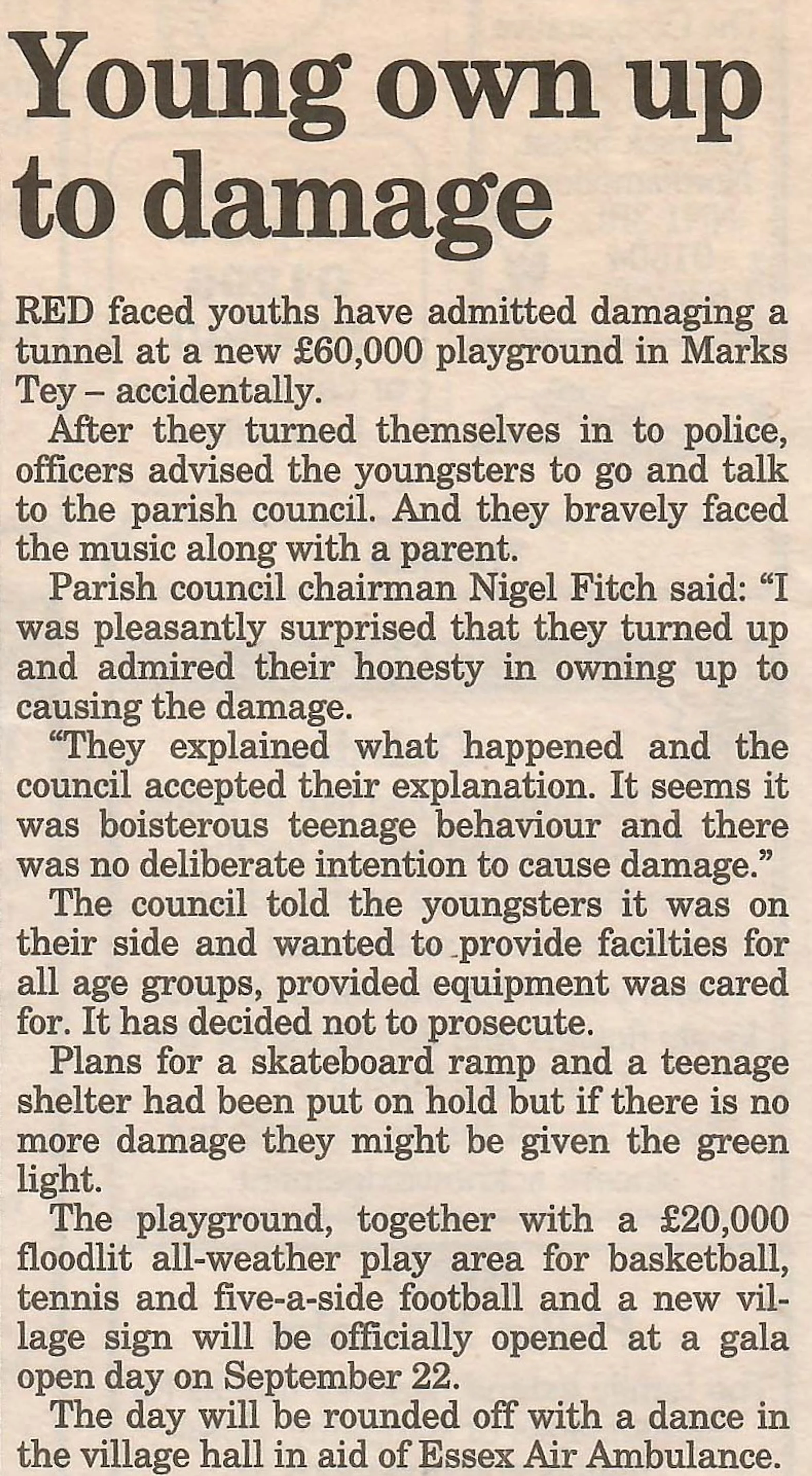 Newspaper report regarding damage to the children’s play area.
