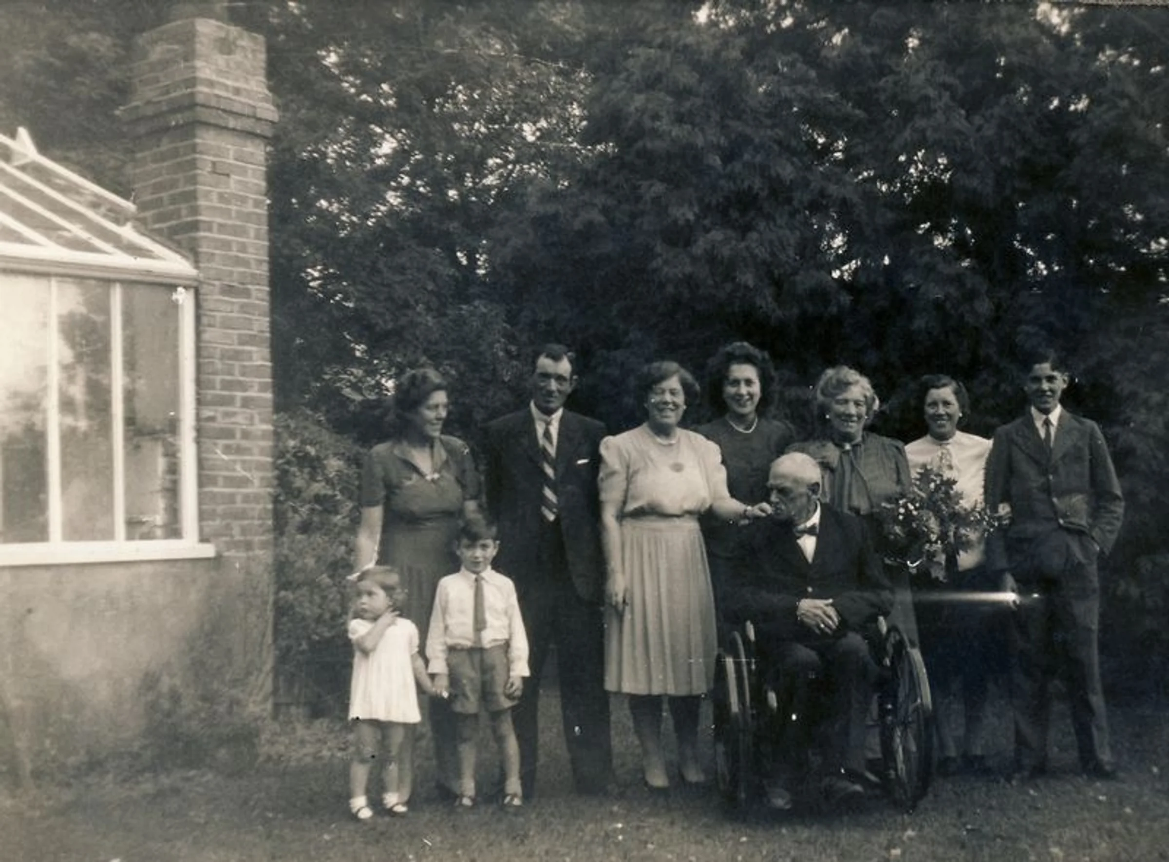 Rosemary Browning (or Browning-Smith) was the granddaughter of Edwin Arthur Croyden who lived at The Acacias on Coggeshall Road, Marks Tey. Edwin and his wife Margaret are recorded there in the 1939 Register. He must be the elderly man in the wheelchair. The occasion was Mr & Mrs Croyden's Golden Wedding.