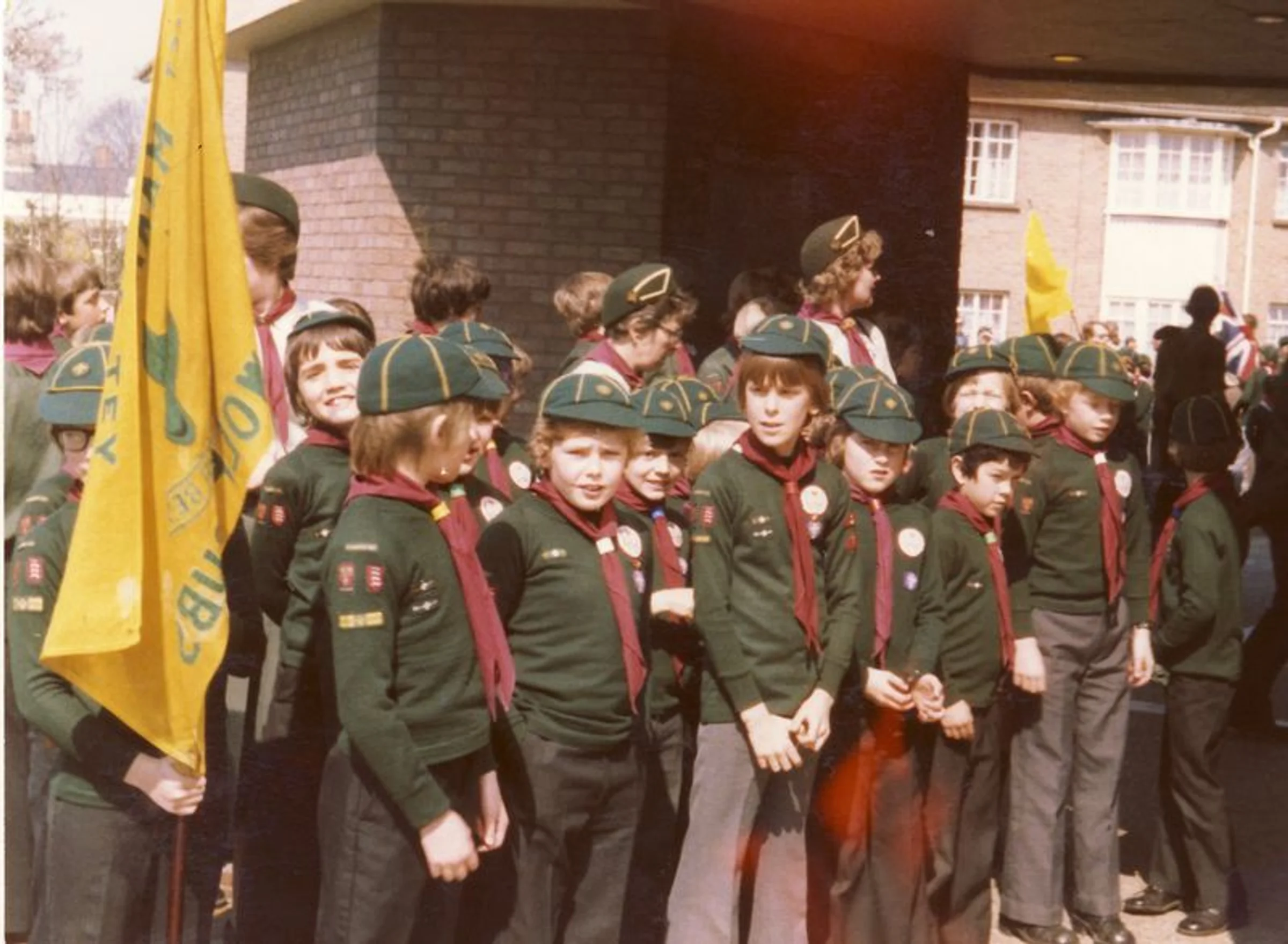 An undated photo of Cubs with their two female leaders. The location is not given but they may be under a brick bridge or shelter with a surburban type house beyond.