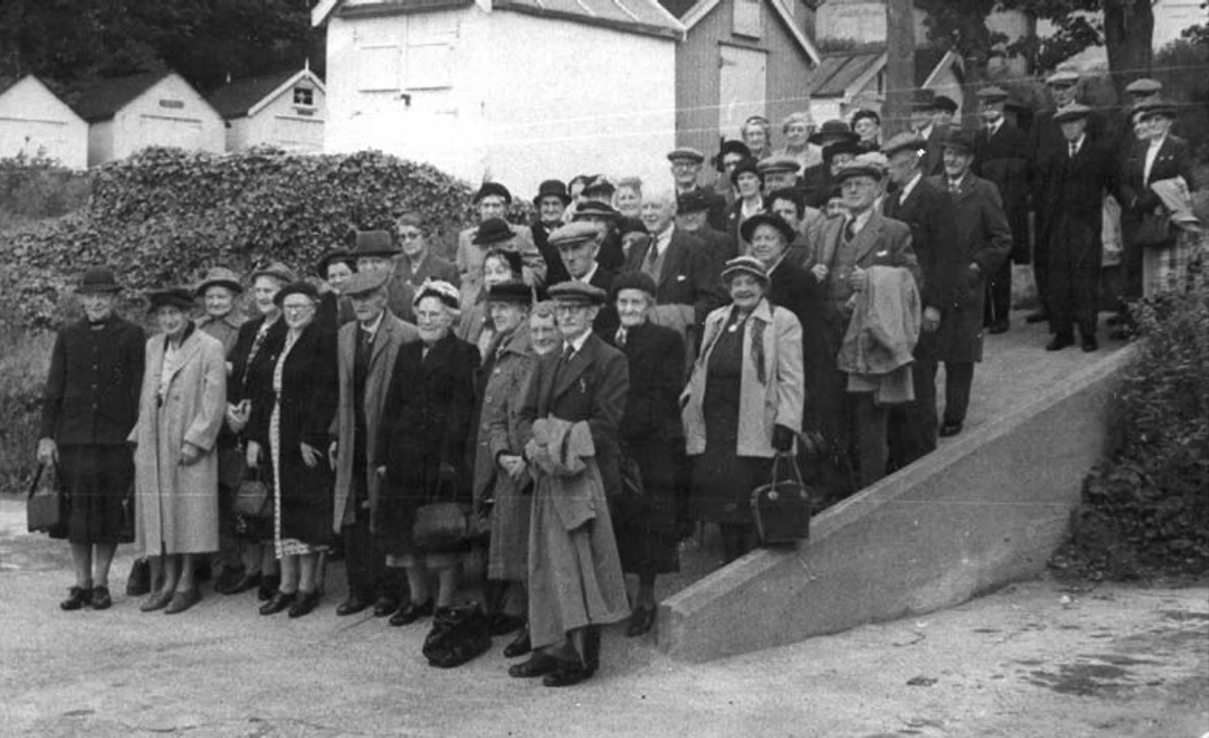An undated photo of an outing by the Darby and Joan Club. The little buildings look like beach huts so it must have been an excursion to the seaside. Some of the people in another photo taken that day have been named.