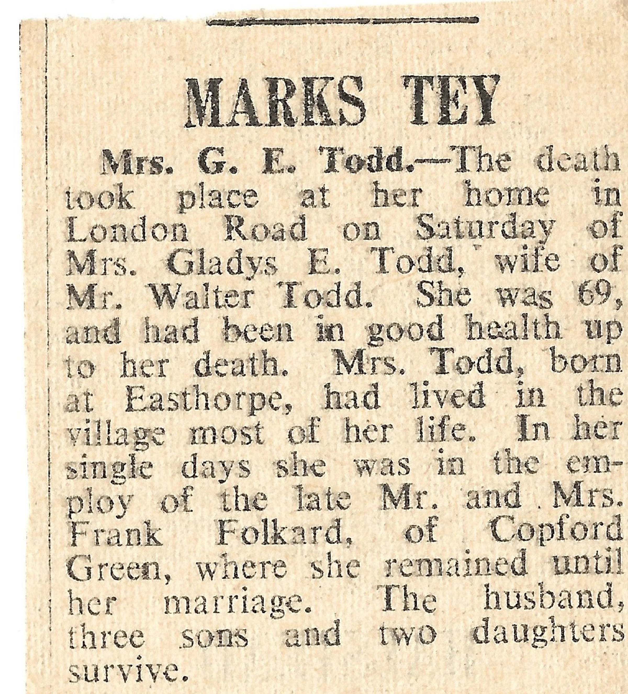 This cutting is undated but the death of Mrs Todd was registered in the Jan-Mar quarter of 1959. Gladys E Todd died at her home in London Road, aged 69y, and she was the wife of Walter Todd. She was born in Eastthorpe and had worked for the Folkard family in Copford before she married.