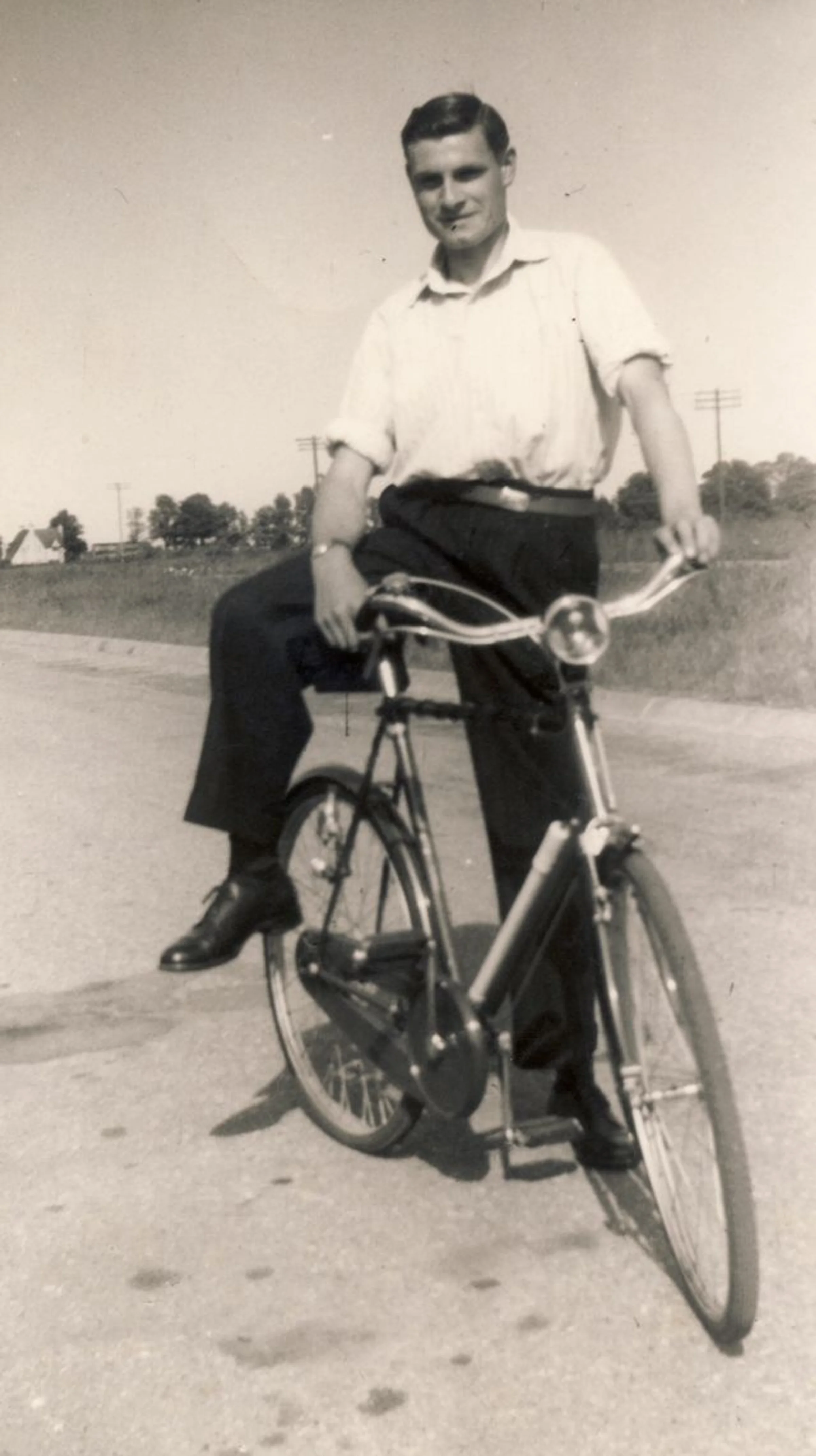 Dennis Todd getting on or off a bicycle in the middle of a quiet road.
