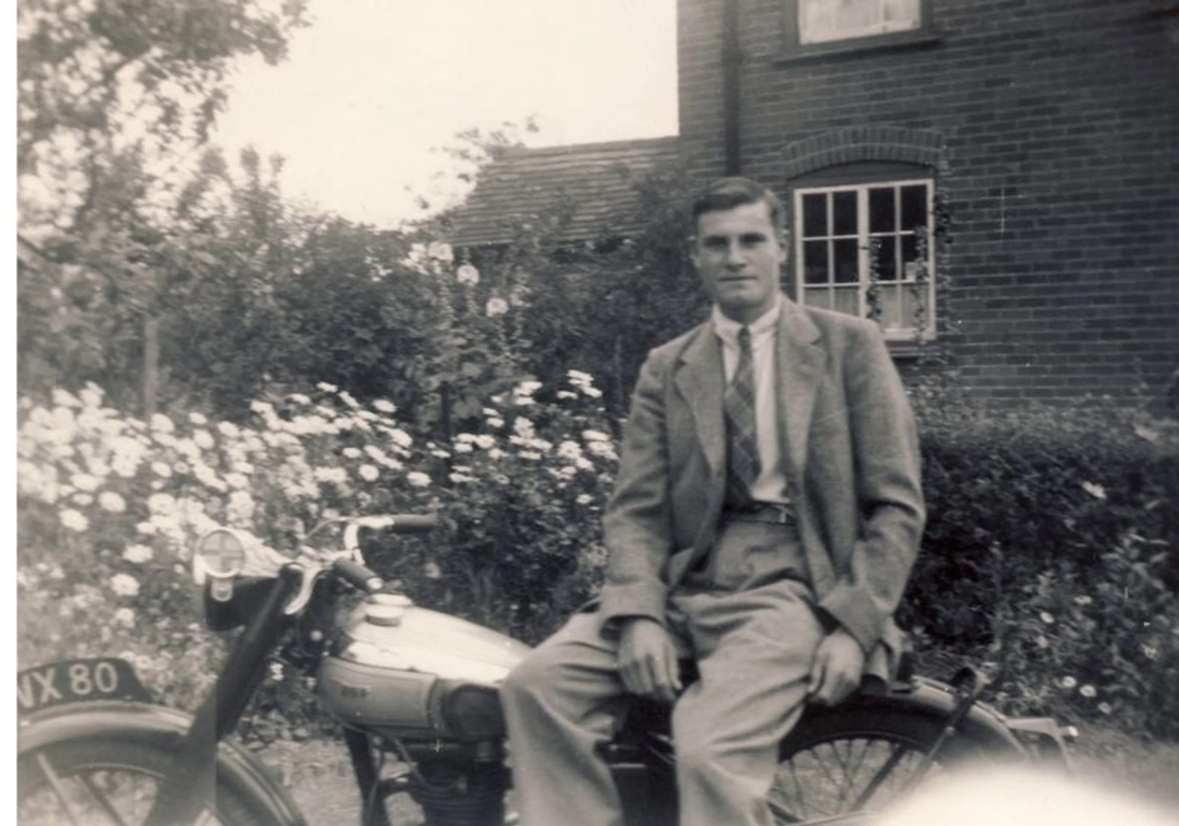Dennis Todd seated on a motorcycle, outside a house which has flowers in the garden.