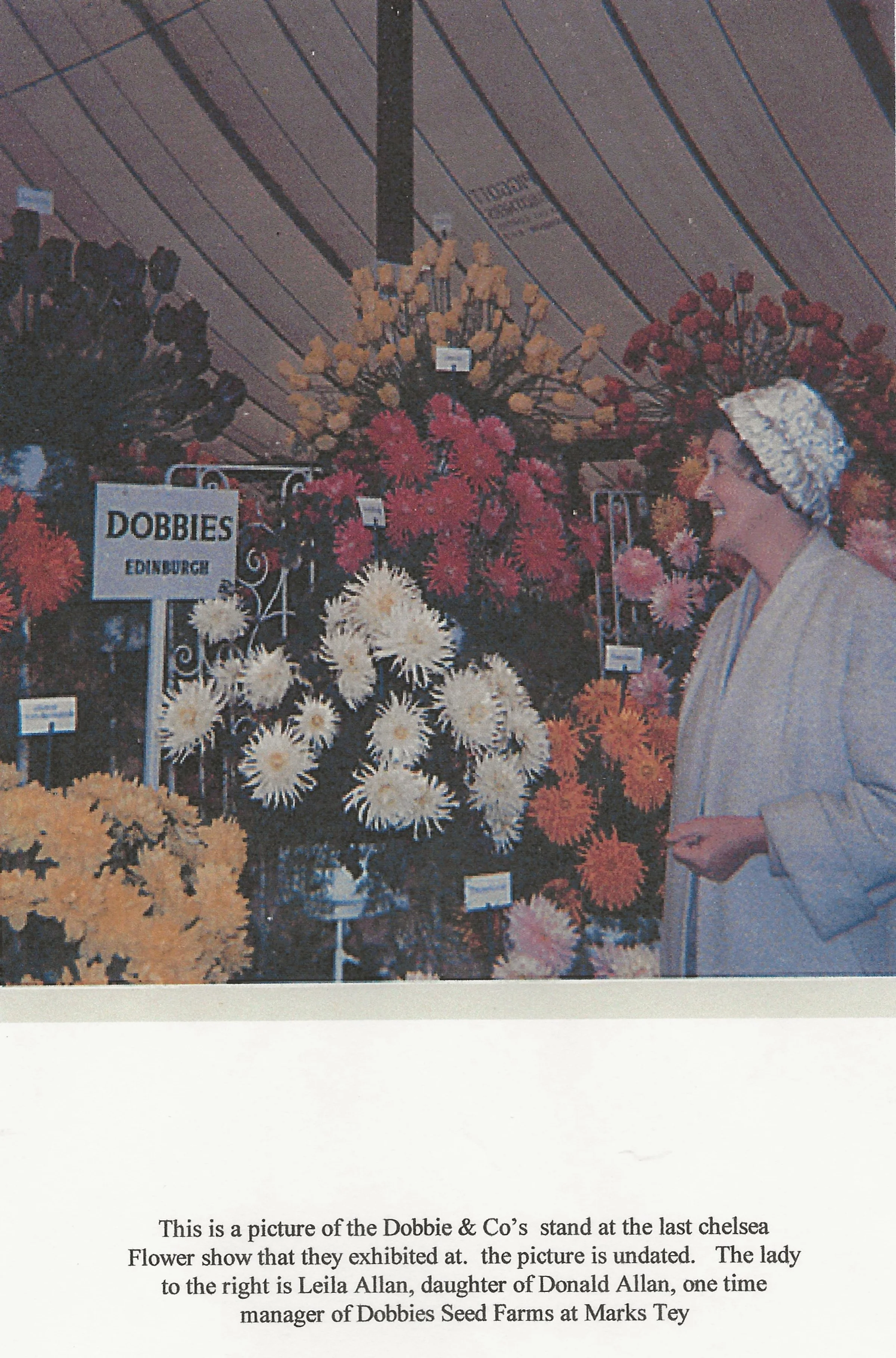 The text says that this was the last Chelsea Flower Show at which Dobbies exhibited. The lady by the stand is Leila Allan, daughter of Donald Allan, at one time the manager of Dobbies at Marks Tey.
