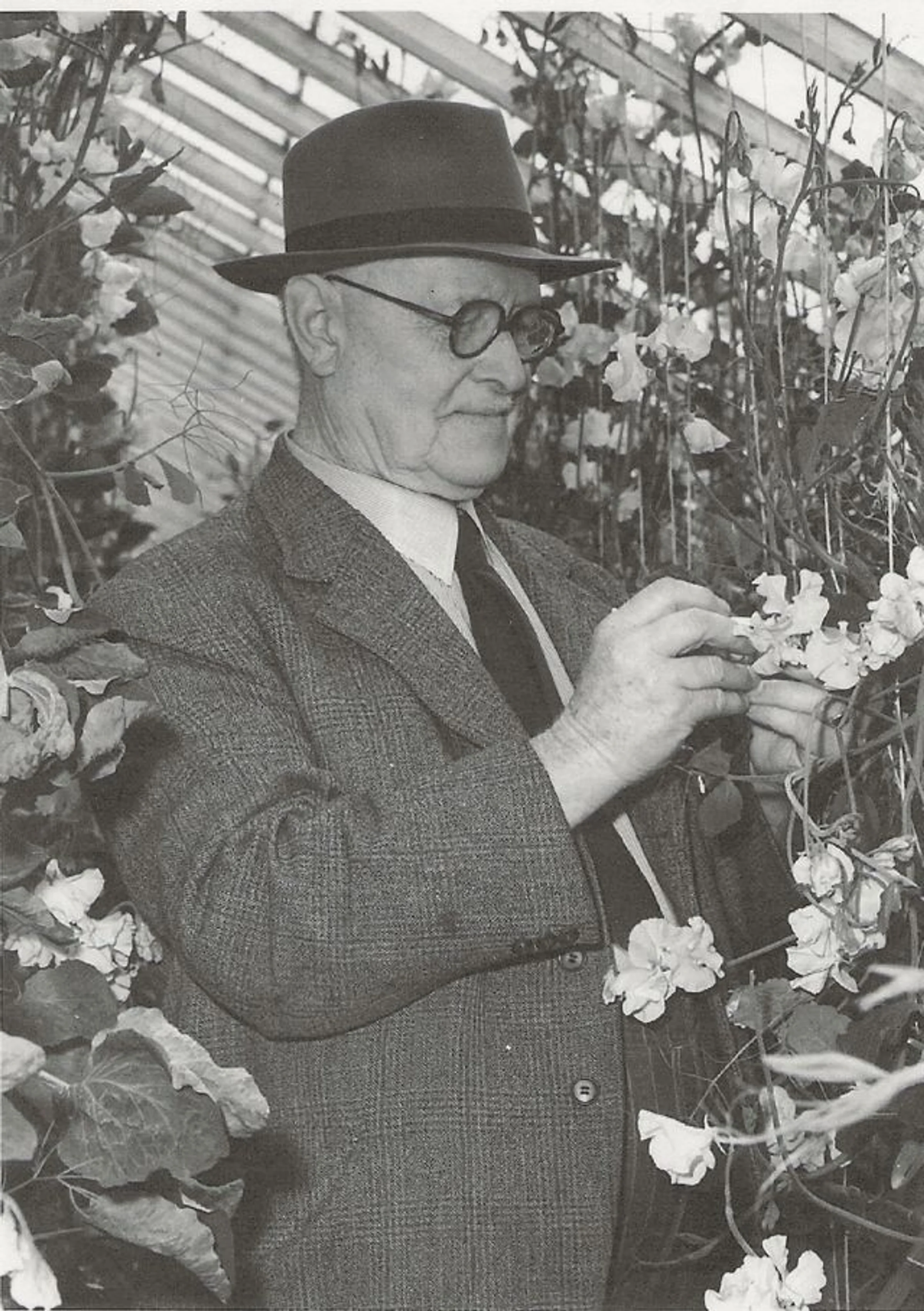 Donald Allan is pictured here inside a greenhouse that has been used for growing sweet peas. It is likely that this is at Dobbies in Dobbies Lane, Marks Tey.