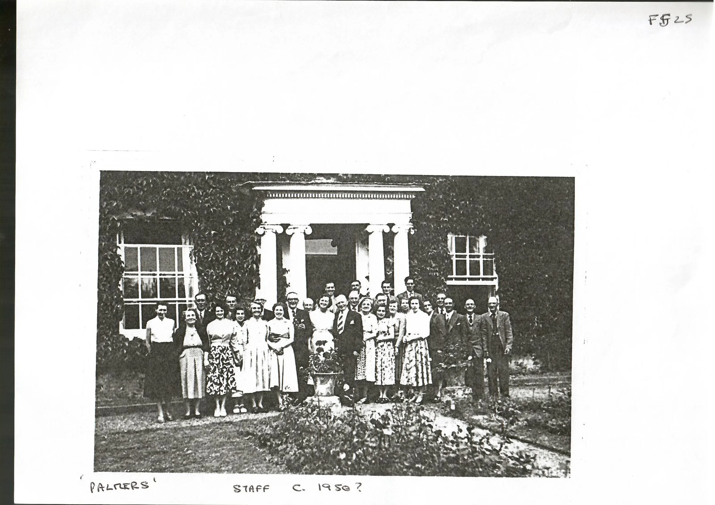 Here is a group of Dobbies staff standing outside Palmers in Dobbies Lane, which was the home of Donald Allan, the manager of the business. The occasion is his retirement.