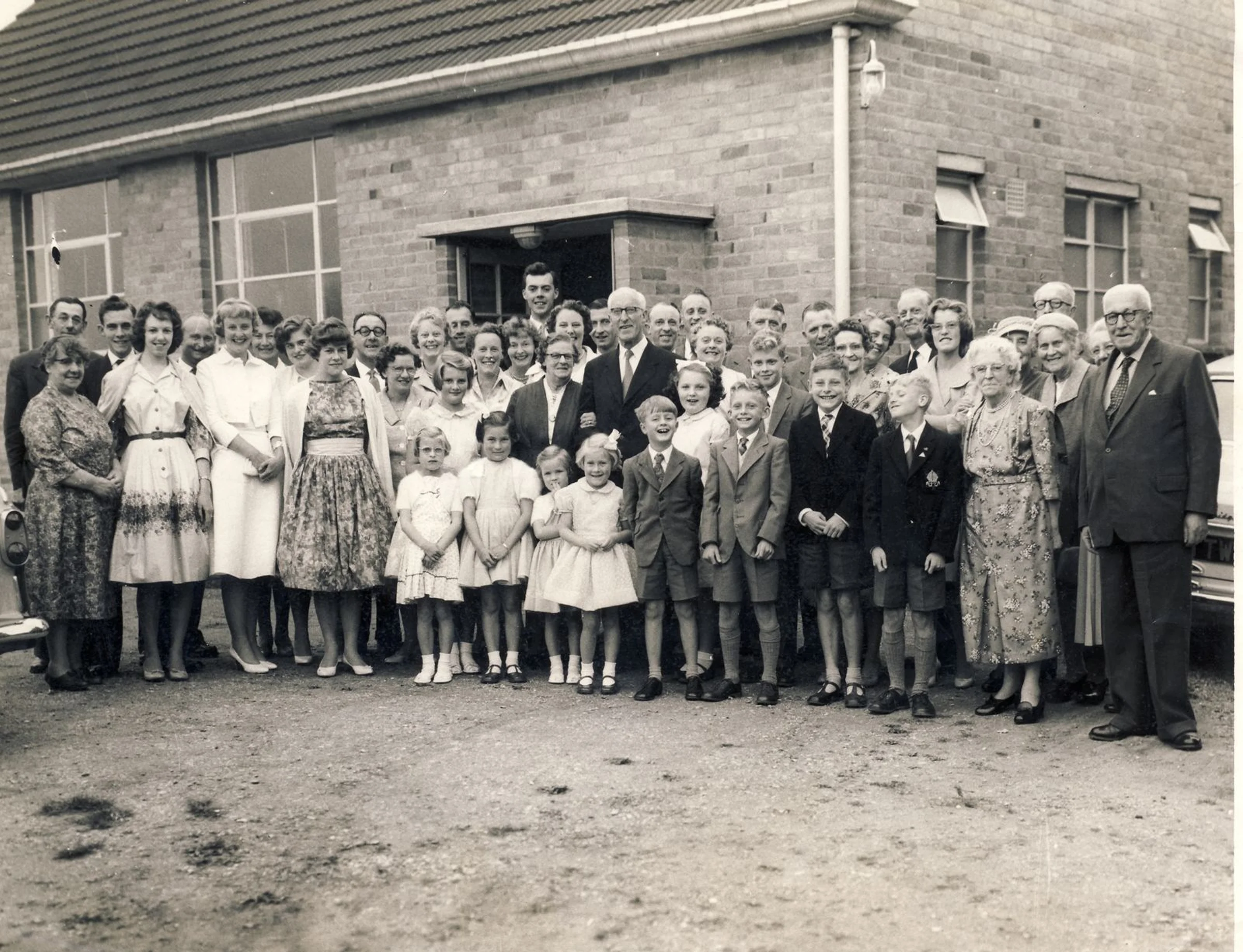 A party gathered together to celebrate the Golden Wedding of Mr B G Dudley and his wife. They are outside the new Sunday School Hall behind the church.