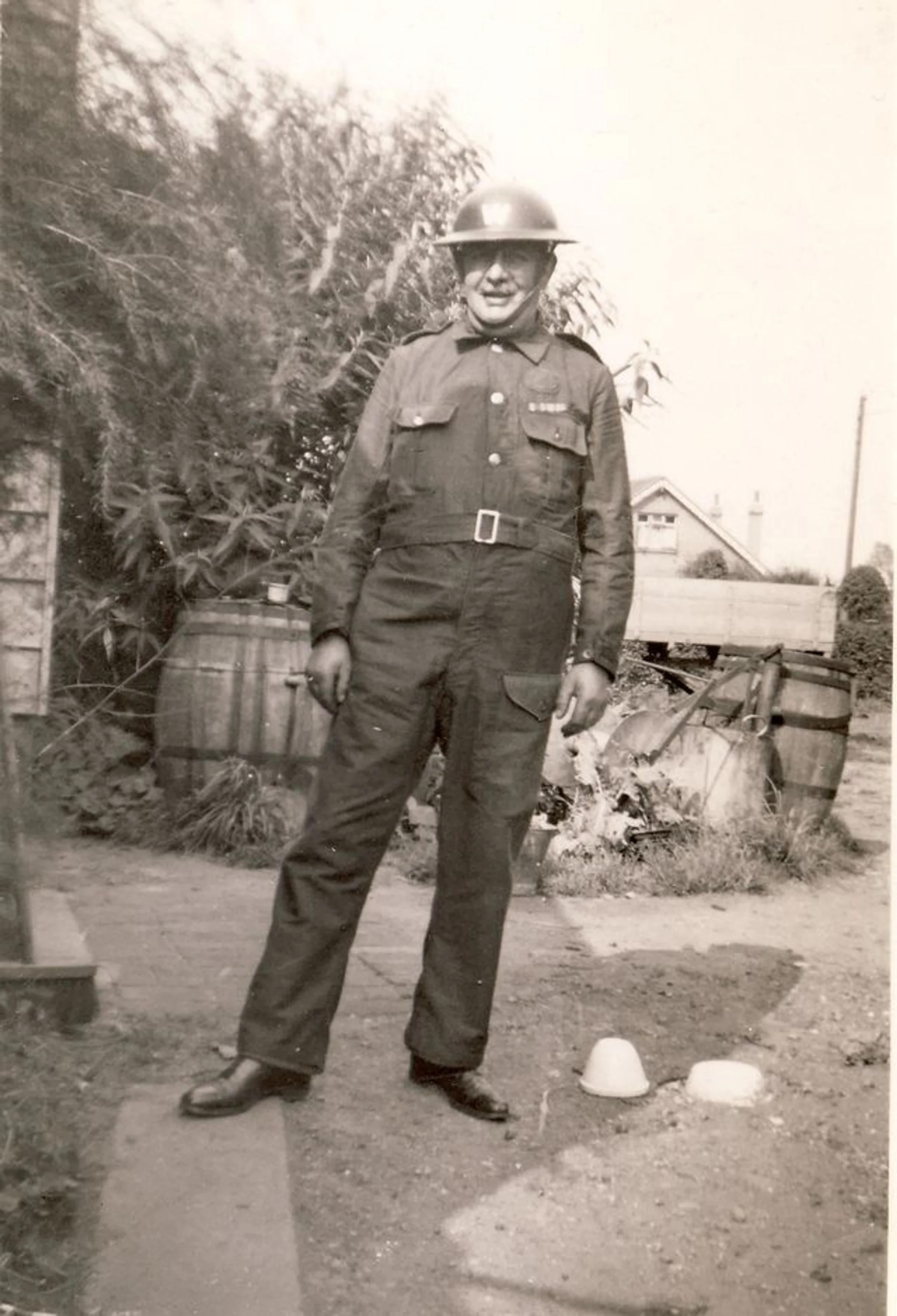 A photo of Ed Polley (Edmund) wearing the uniform of an ARP Warden, ARP standing for Air Raid Precautions. It must have been taken during WW2.
