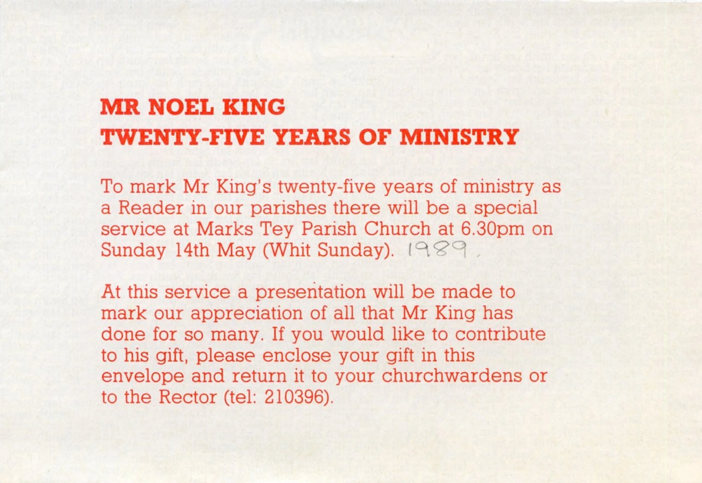 A request for donations to celebrate 25 years of Noel King being a Reader. A presentation will be made on Whit Sunday, 14 May 1989.