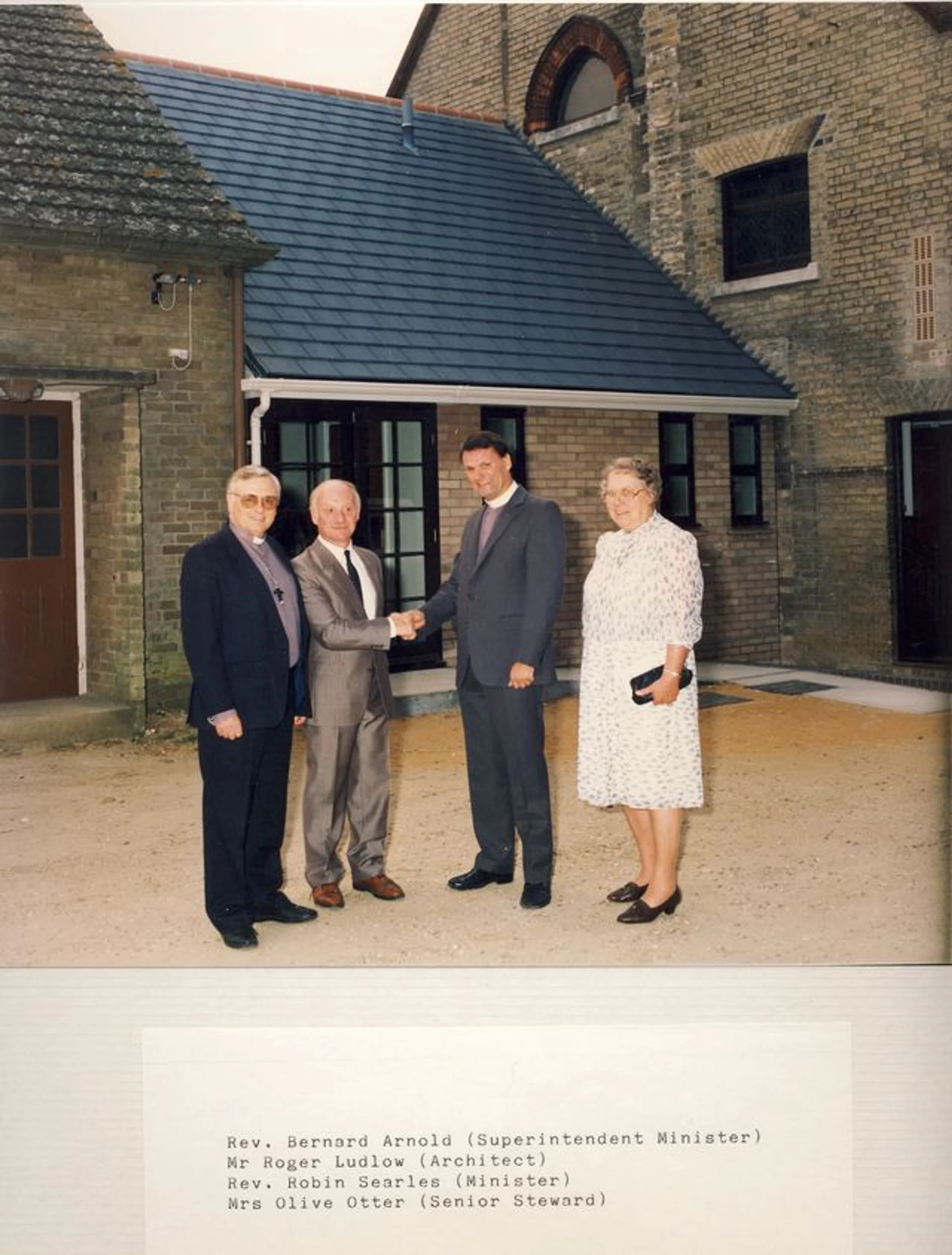 The work has been done to make a link between the two Methodist buildings. This is the opening ceremony of the extension including Rev Robin Searles (Minister) and Mrs Olive Otter (Senior Steward) on 10 September 1991.