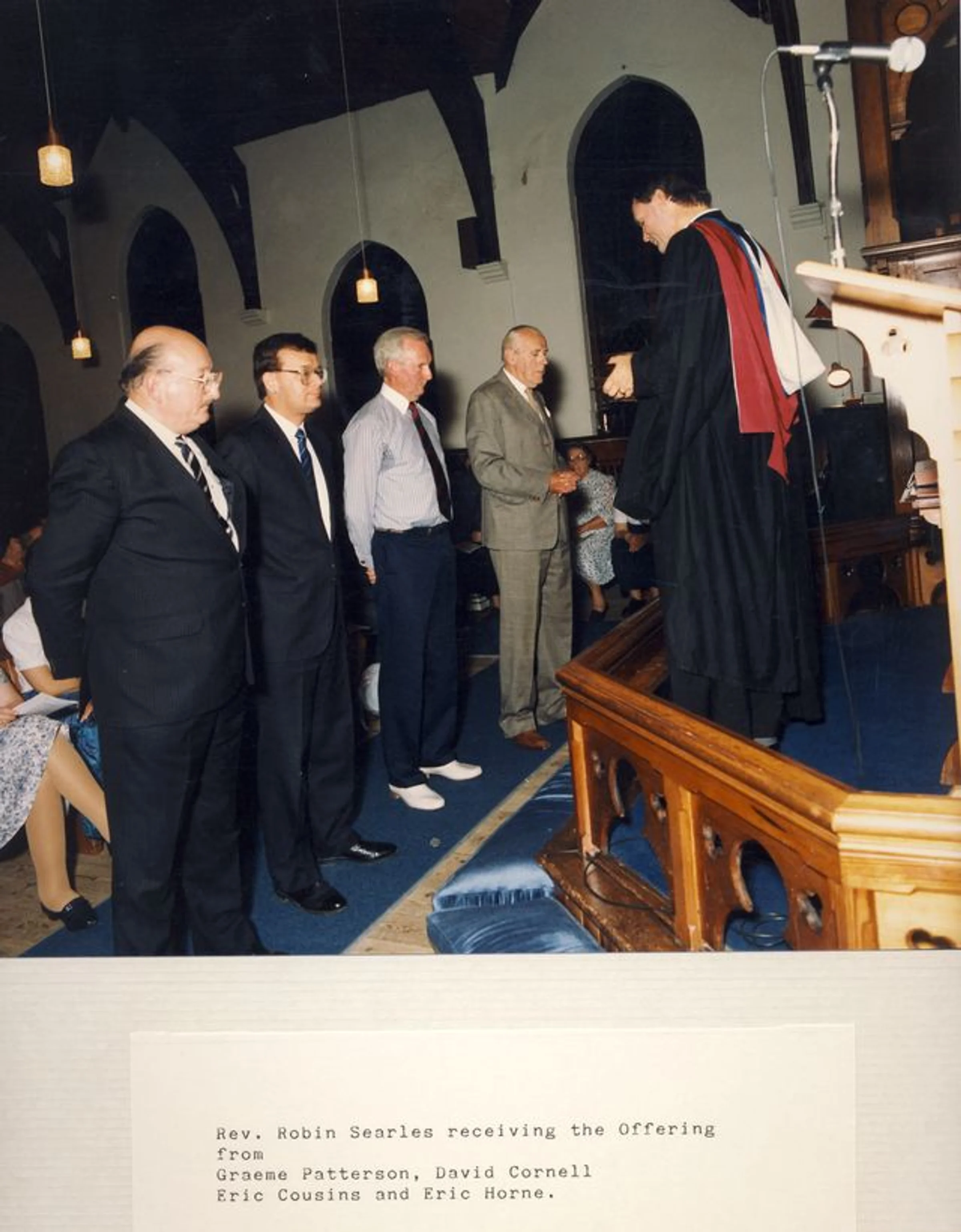 Rev Robin Searles receiving the offering from Graeme Patterson, David Cornell, Eric Cousins and Eric Horne at the Thanksgiving Service for the extension on 10 September 1991.