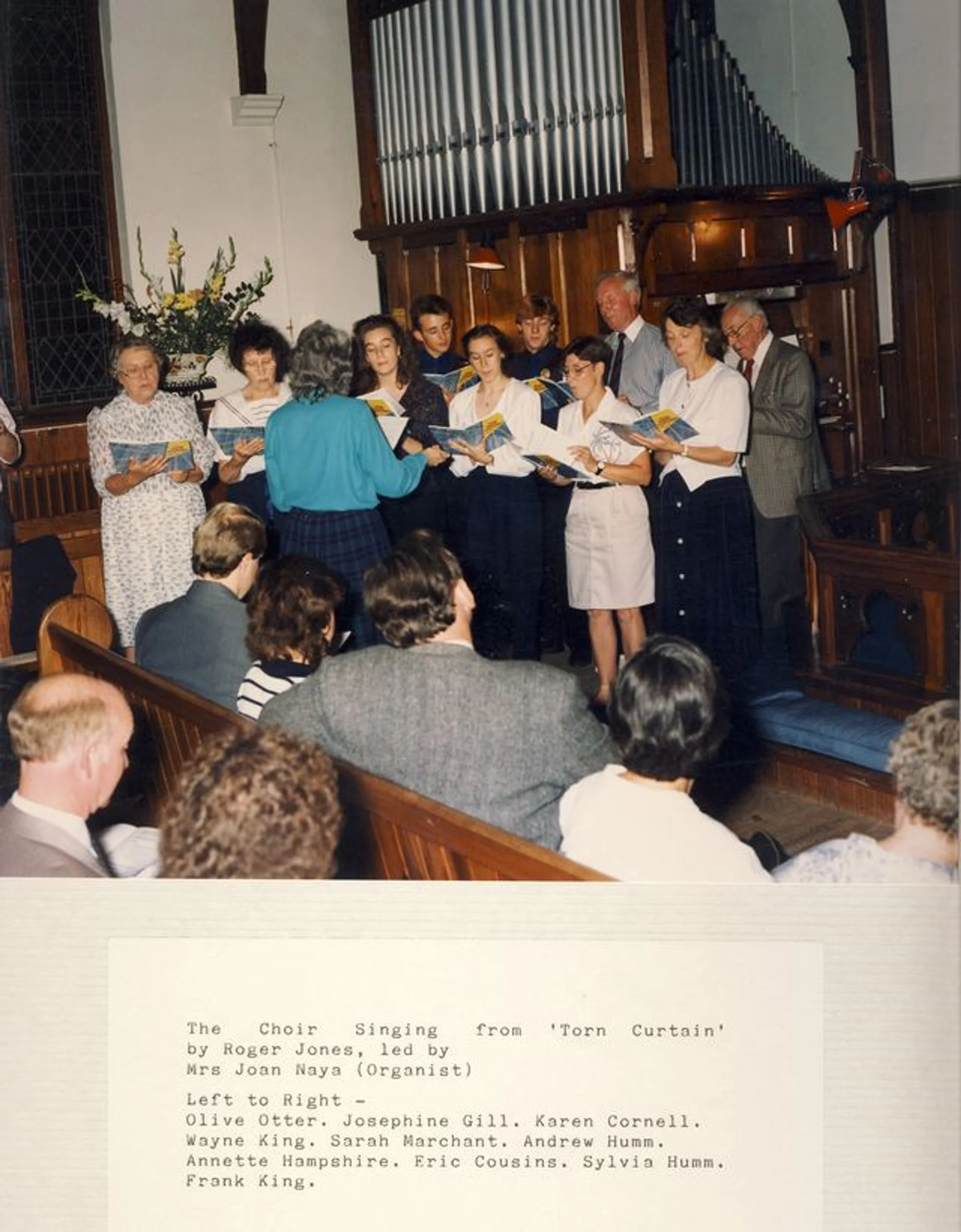 The choir singing from 'The Torn Curtain' at the Thanksgiving Service for the opening of the extension on 10 September 1991. The organist was Joan Naya and the choir included Olive Otter, Josephine Gill, Karen Cornell, Wayne King, Sarah Marchant, Andrew Humm, Annette Hampshire, Eric Cousins, Sylvia Humm and Frank King.