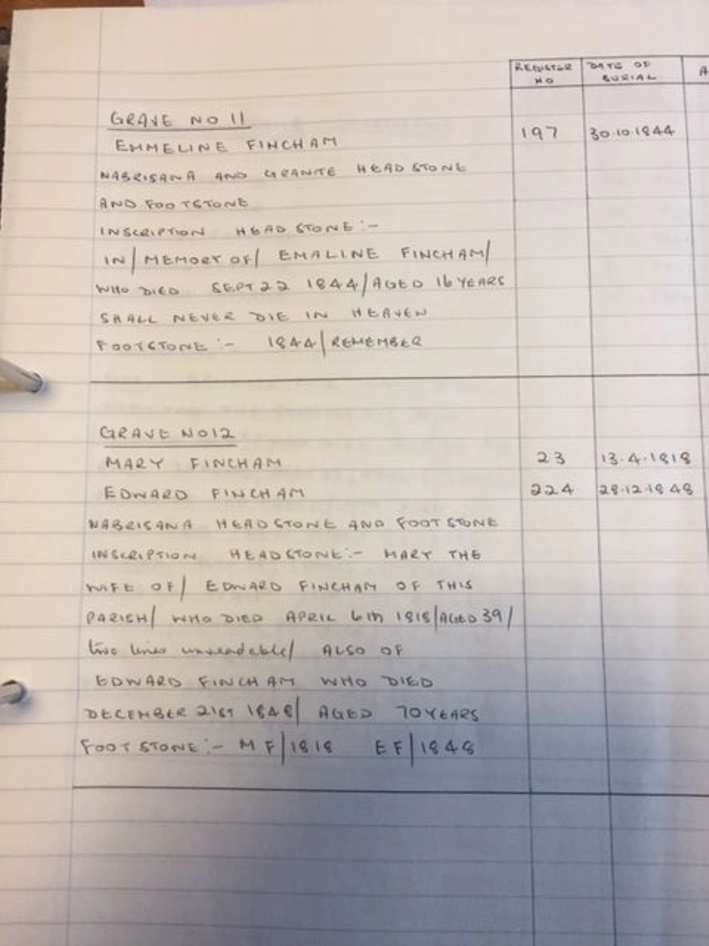 The monumental inscriptions for the graves of Edward Fincham buried in 1848 and for his wife, Mary Fincham in 1818, also Emmeline Fincham who was buried in 1844 aged 16y .