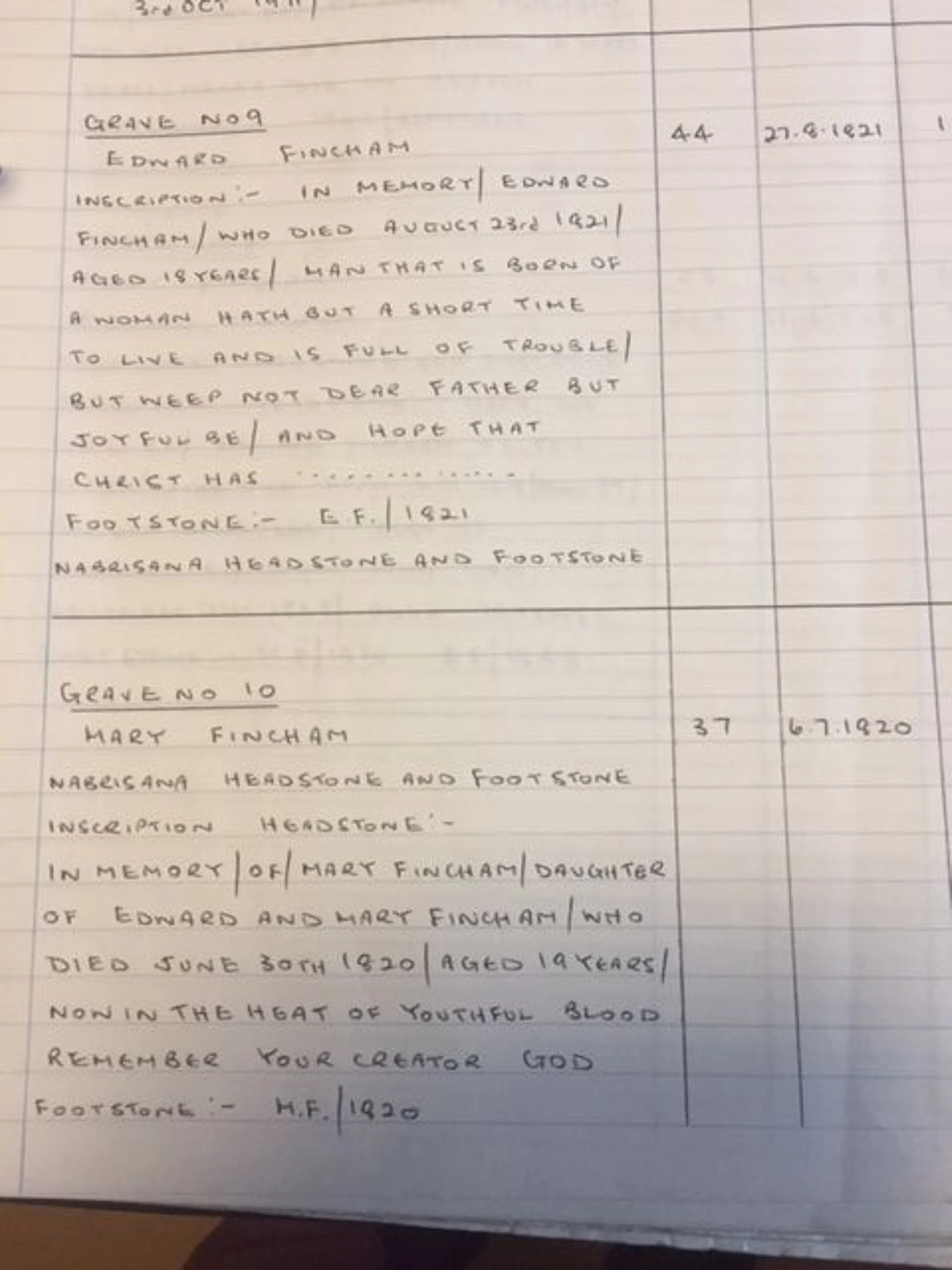 The monumental inscriptions for the graves of Edward Fincham buried in 1821 aged 18y and for his sister, Mary Fincham in 1820 aged 19y.