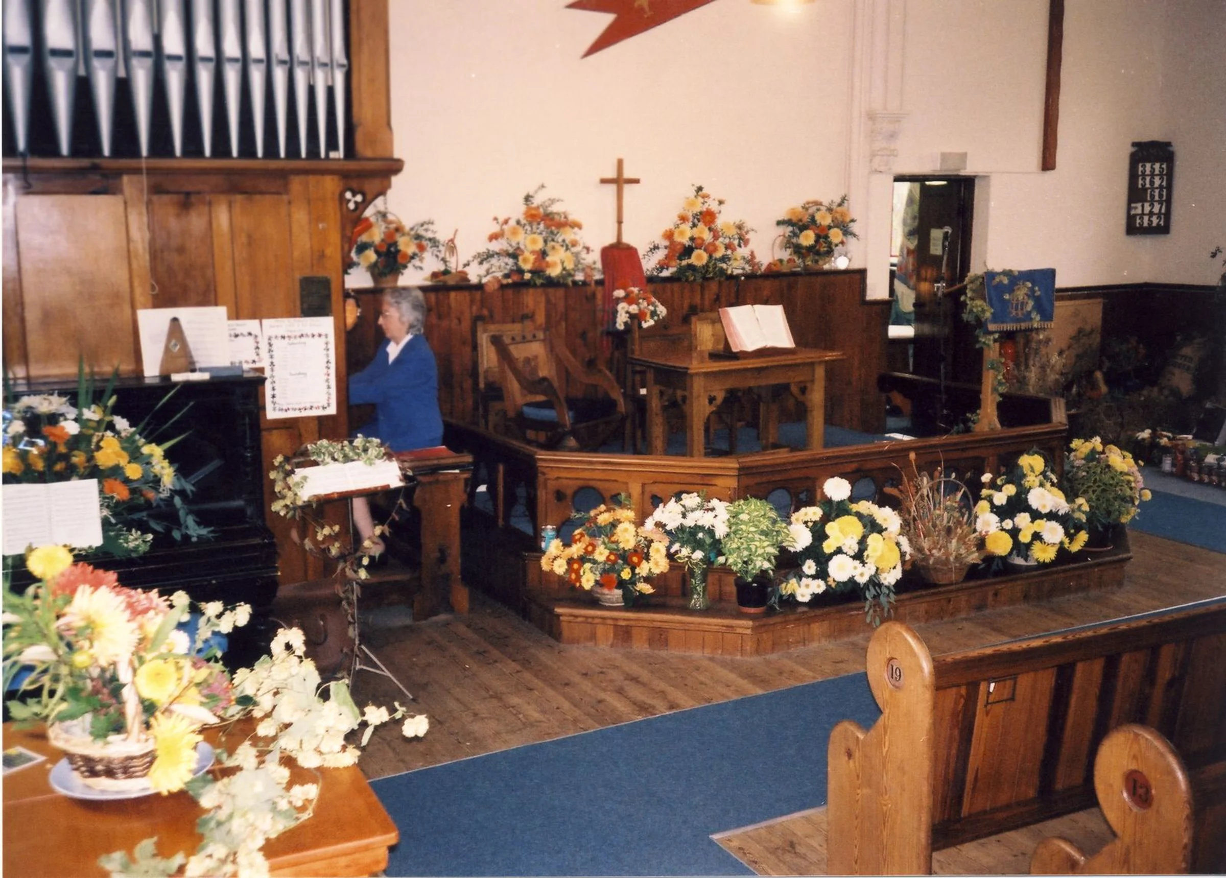 Many flowers arranged in the Methodist Church and an organist (probably Joan Naya) playing.