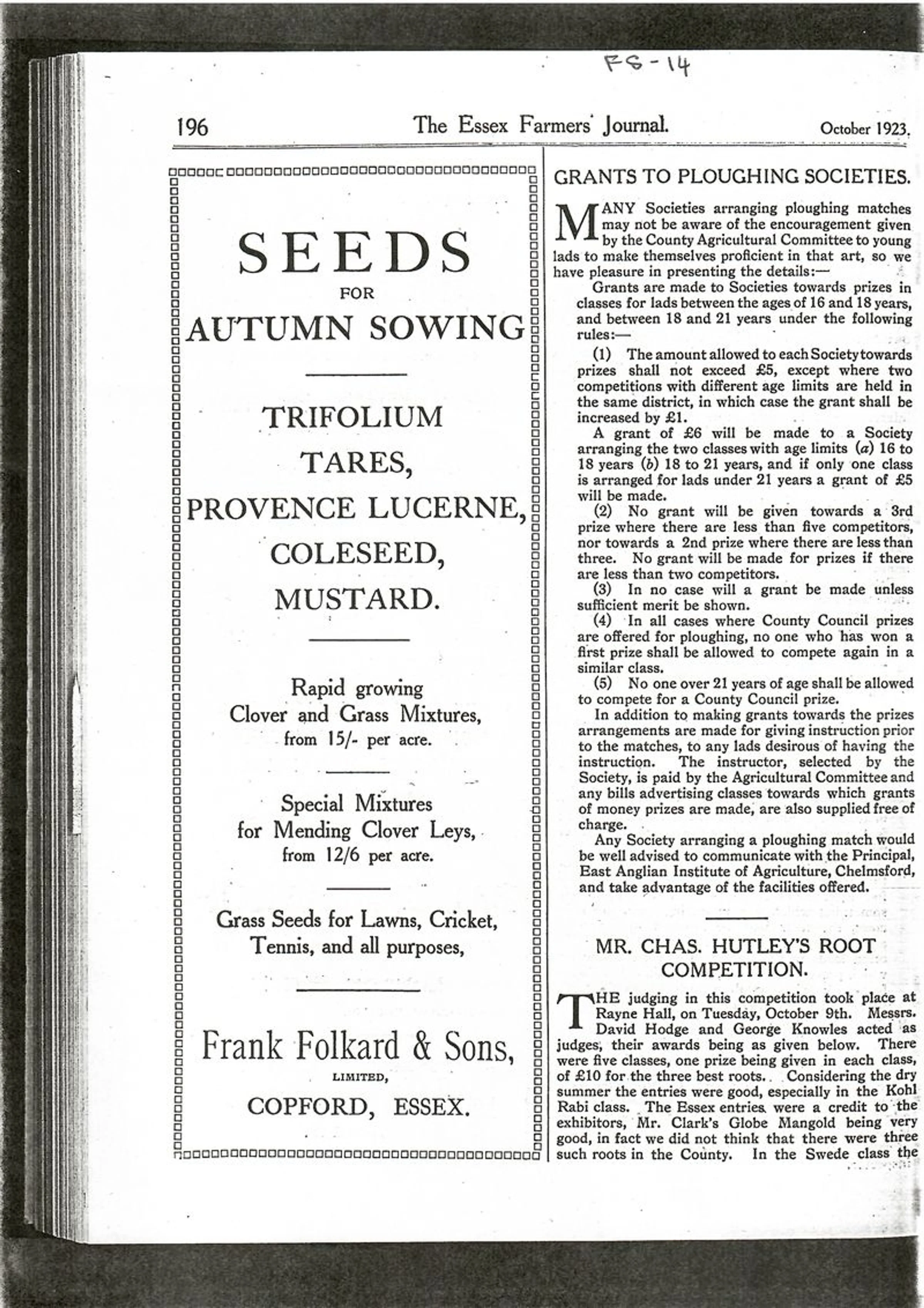 An advertisement for seeds sold by Frank Folkard of Copford. Marks Tey is not mentioned but by 1933 it is.