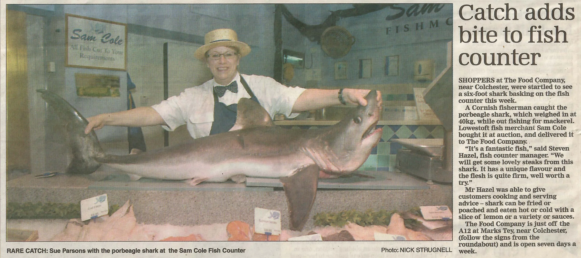 Newspaper photograph and report regarding a porbeagle shark at the the fish counter, Food Company.