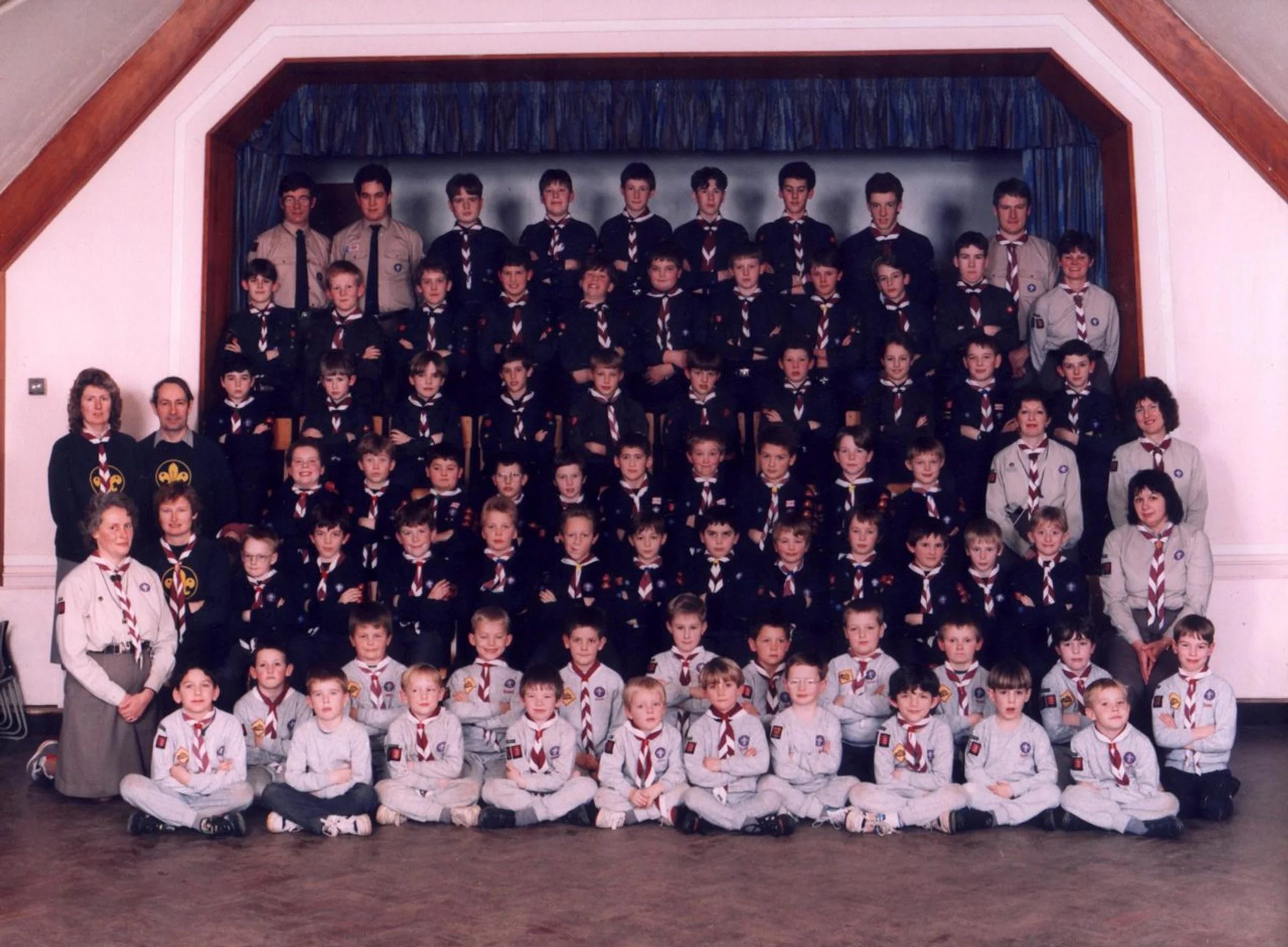 A photo taken in St Andrews's Church Hall of Beavers, maybe Cubs and Scouts in and on the stage arranged in tiers. There are several leaders. On the left is Corinne Sermons. The surnames of the boys in the Beavers include Hillier, Dumbrell and Dodd.