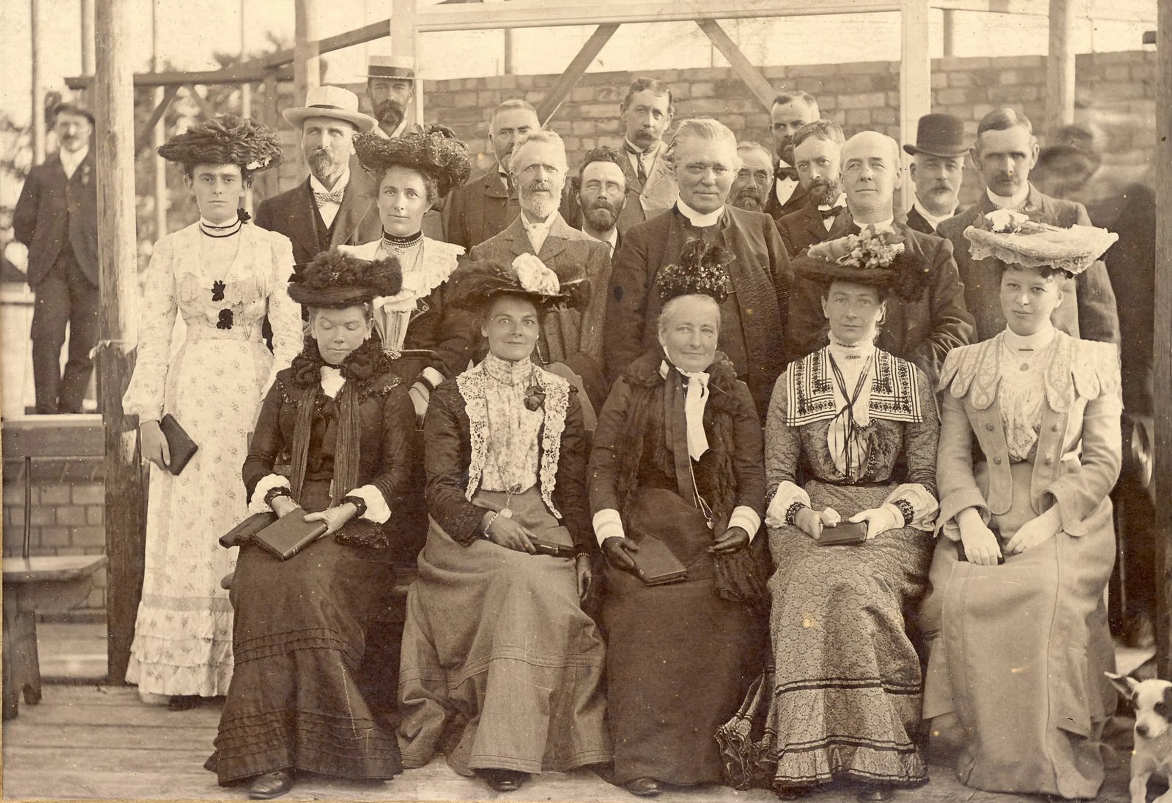 A gathering for the founding of the new Methodist Church building. The ladies are mostly seated and wearing hats with the men standing behind them.