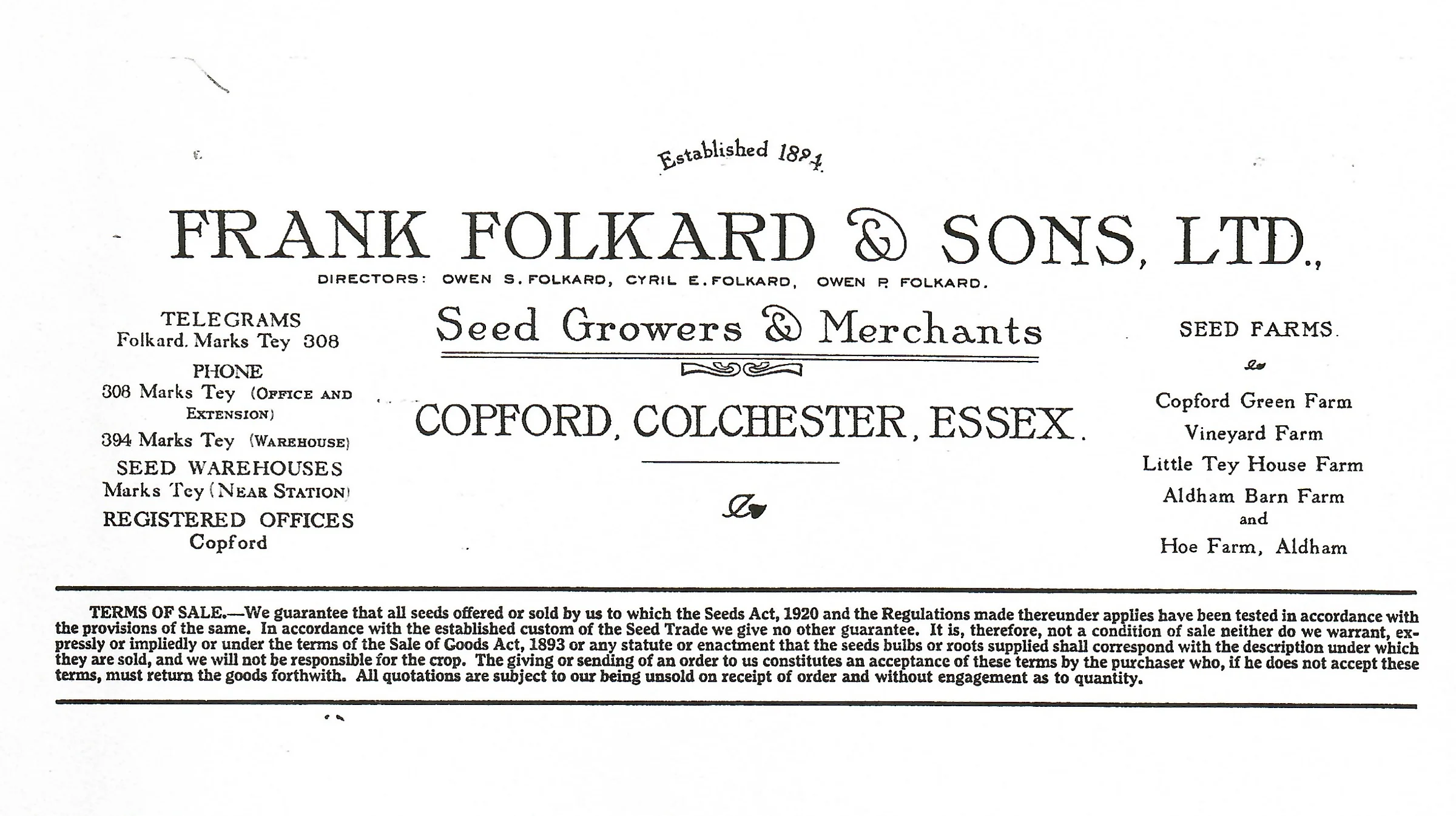 Frank Folkard & Sons Ltd was based in Copford but had premises in Marks Tey. This shows that they produced seeds at Little Tey House Farm and had their warehouse near Marks Tey station (which was in the old maltings building).