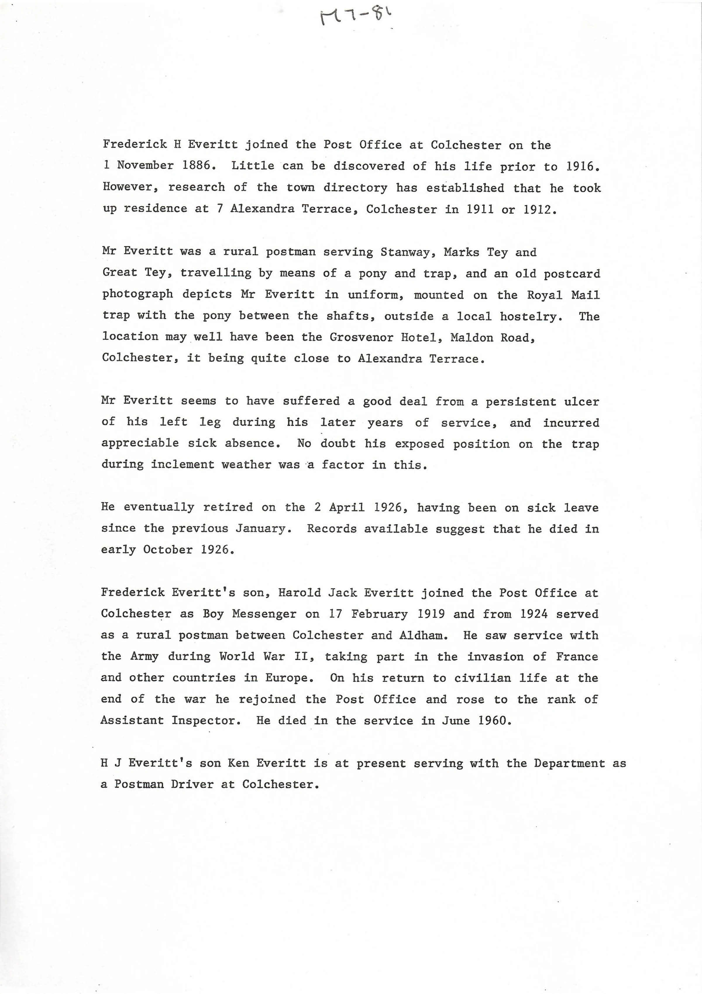 Frederick Everitt was employed as a postman in Colchester. He travelled with a pony and trap delivering to Stanway, Marks Tey and Aldham. He suffered with a persistent leg ulcer then had an accident at work that produced broken ribs and contusions. He retired and died in 1926.