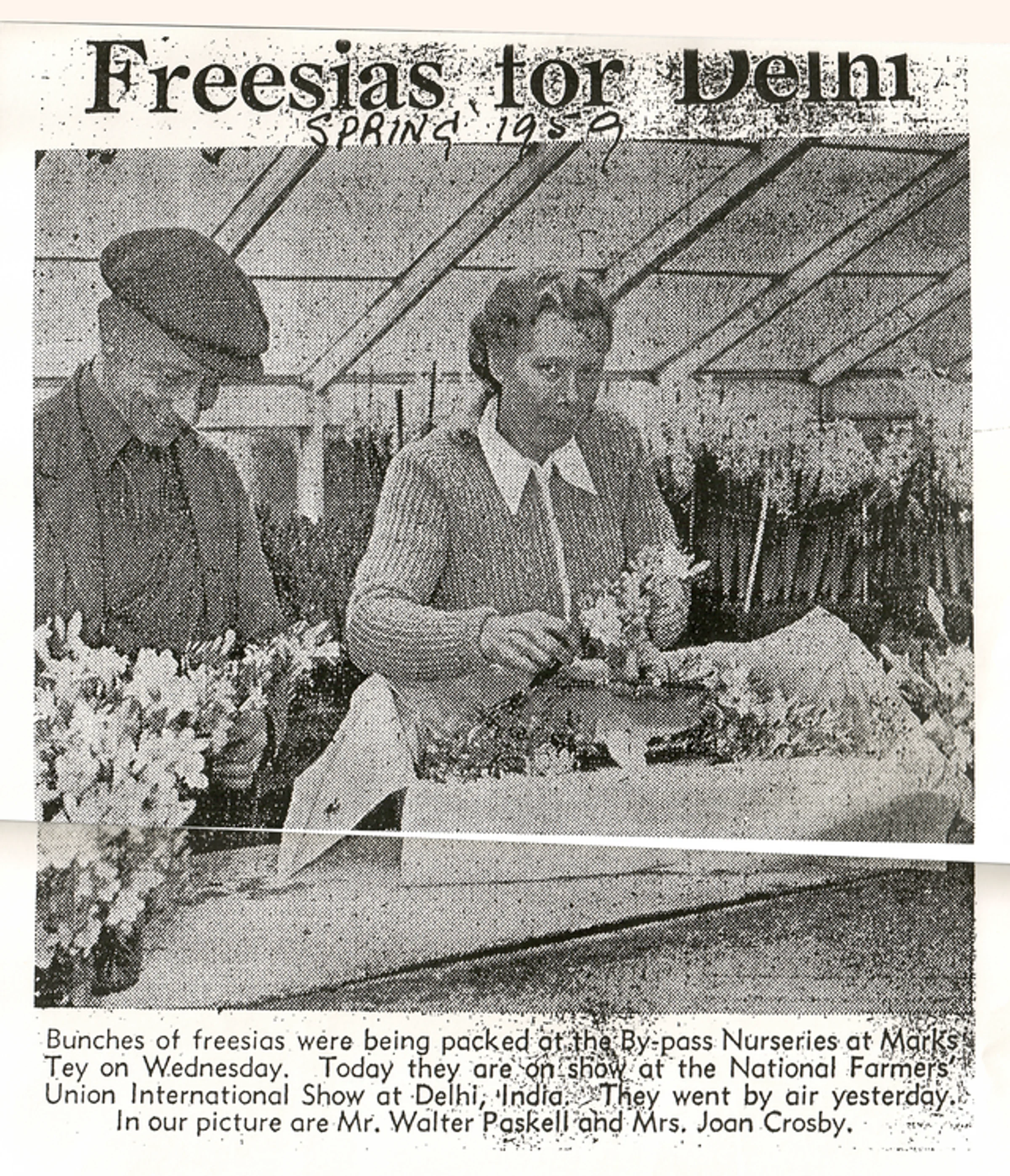An photograph in an unnamed newspaper showing Walter Paskell and Joan Crosby packing freesias grown at By-pass Nurseries to be exhibited in Delhi.