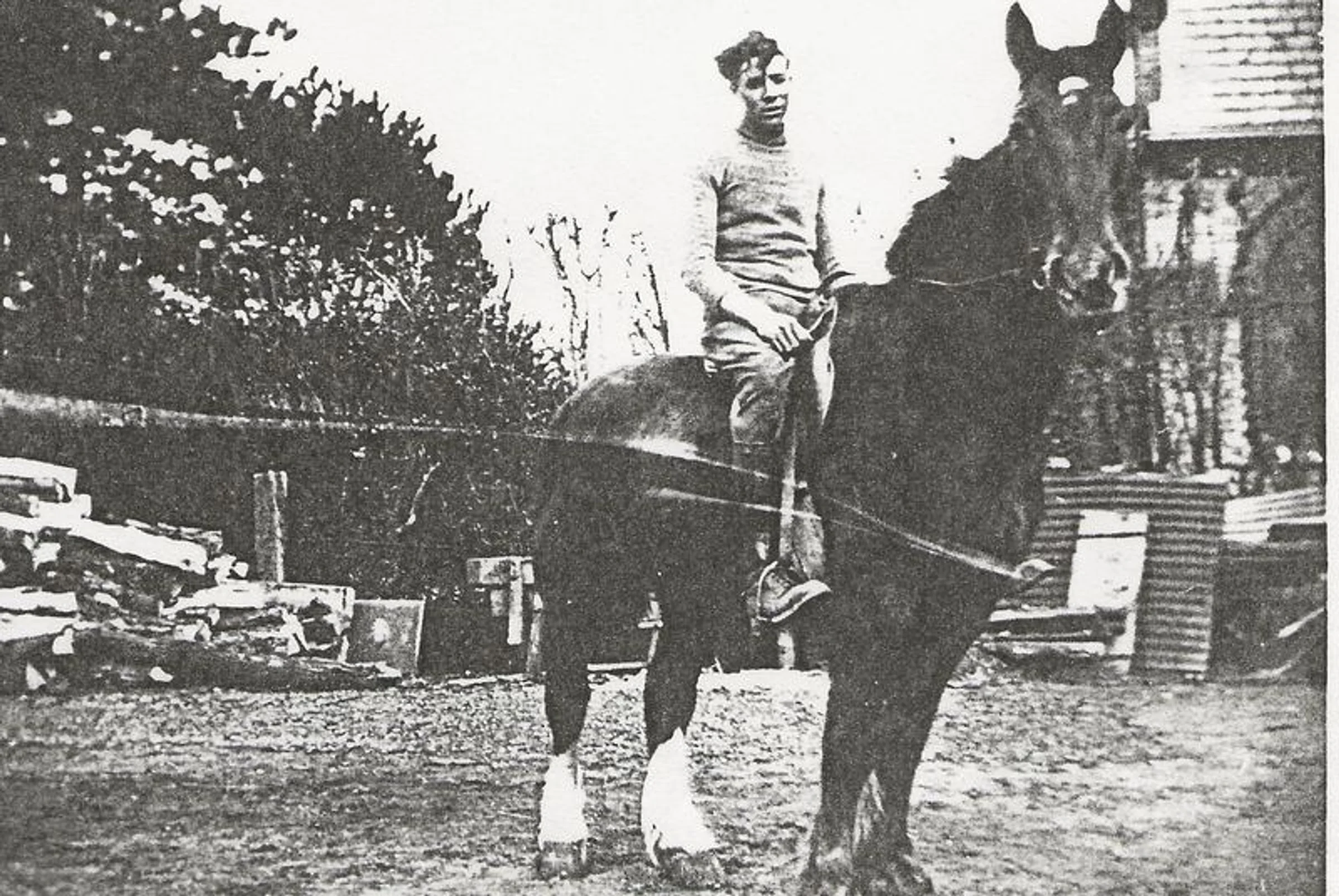 George Polley sitting on a horse. Marks Tey Methodist church can be seen behind. The photo was taken c1938.