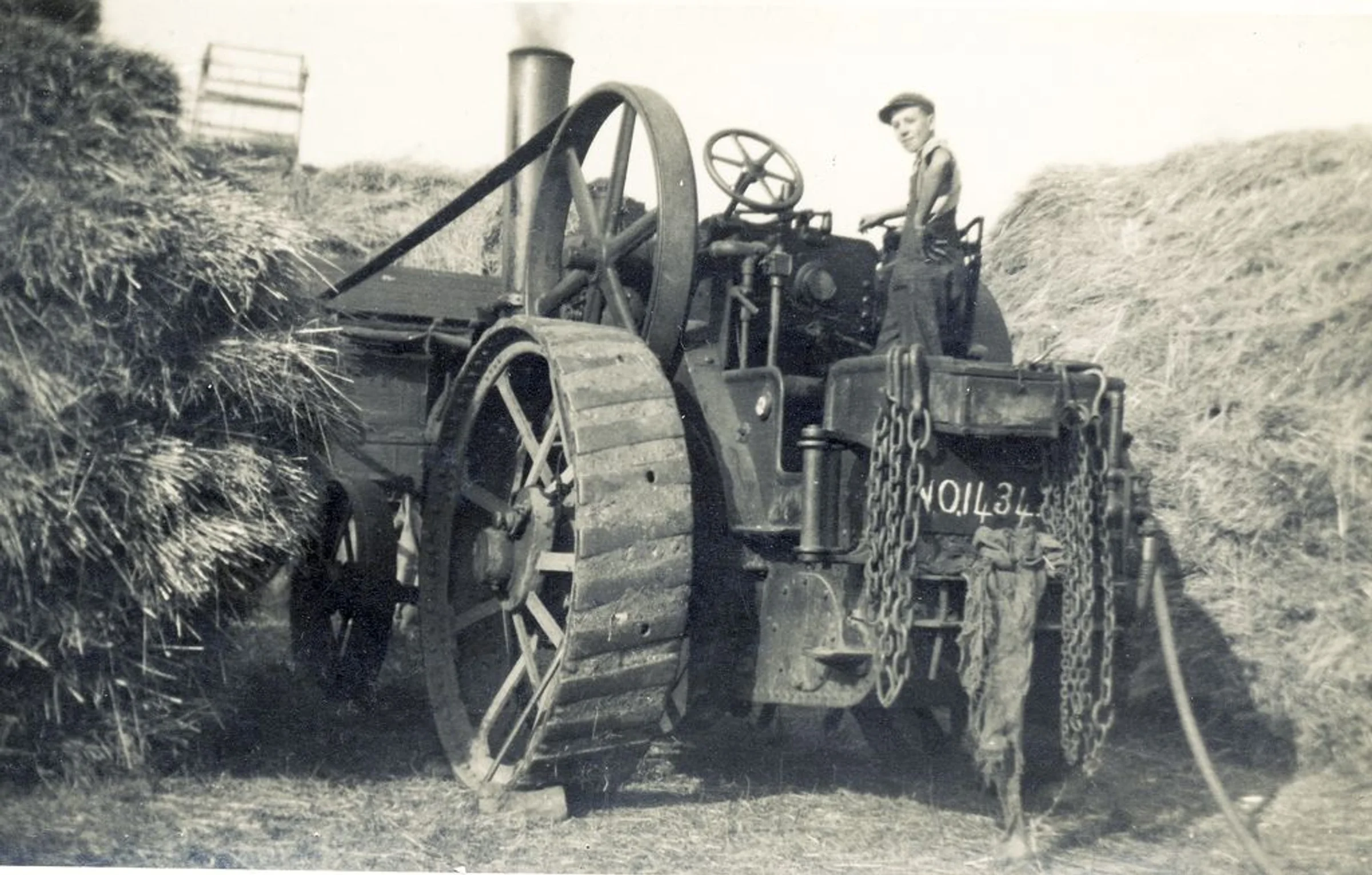 George Polley on a Wallis & Steevens engine, registration number NO 1434. Thought to be threshing at Hole Farm, Copford in 1935 or 1936 (assuming the reverse image is for the same photo).
