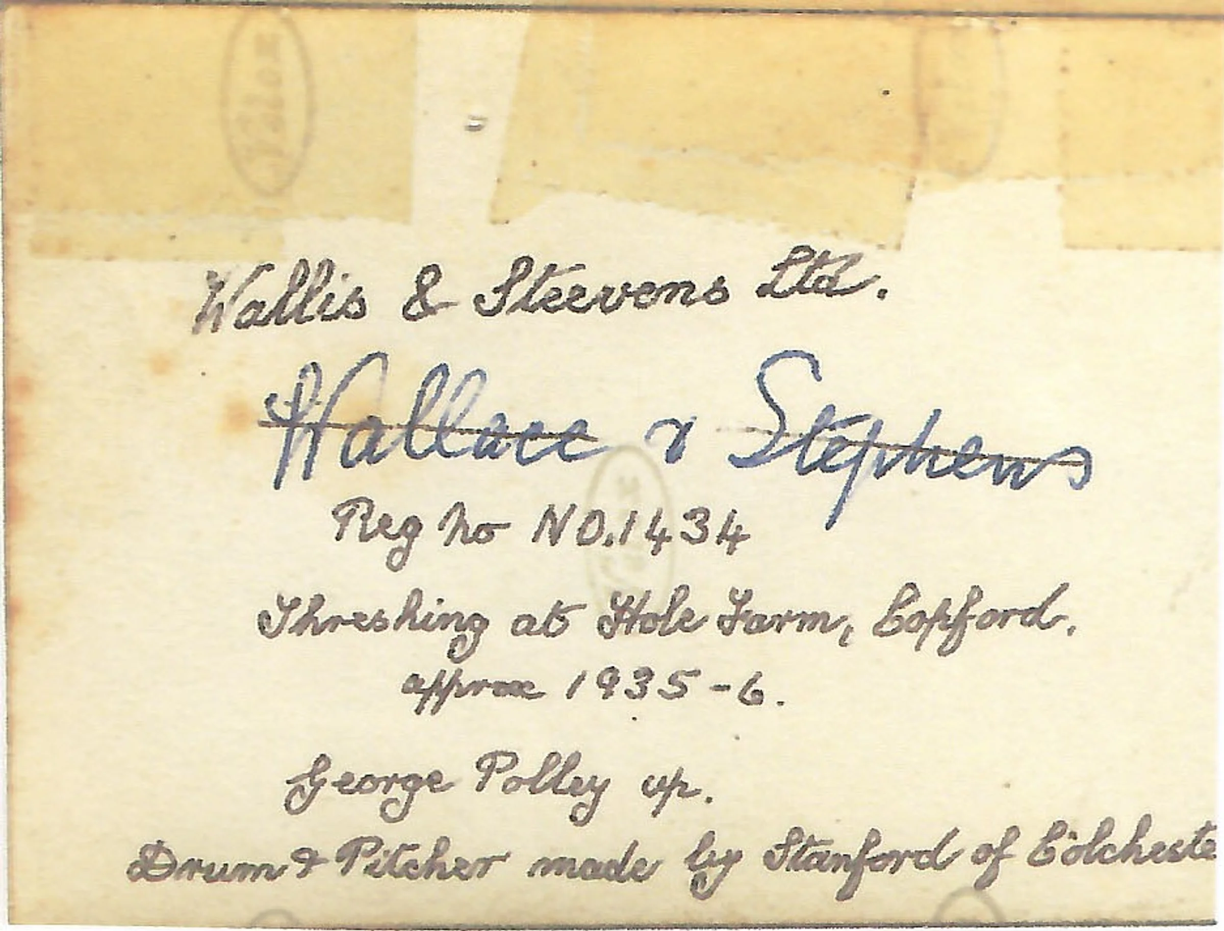 George Polley on a Wallace & Steevens engine, registration number NO 1434. Thought to be threshing at Hole Farm, Copford in 1935 or 1936 (assuming this reverse image is for the same photo).