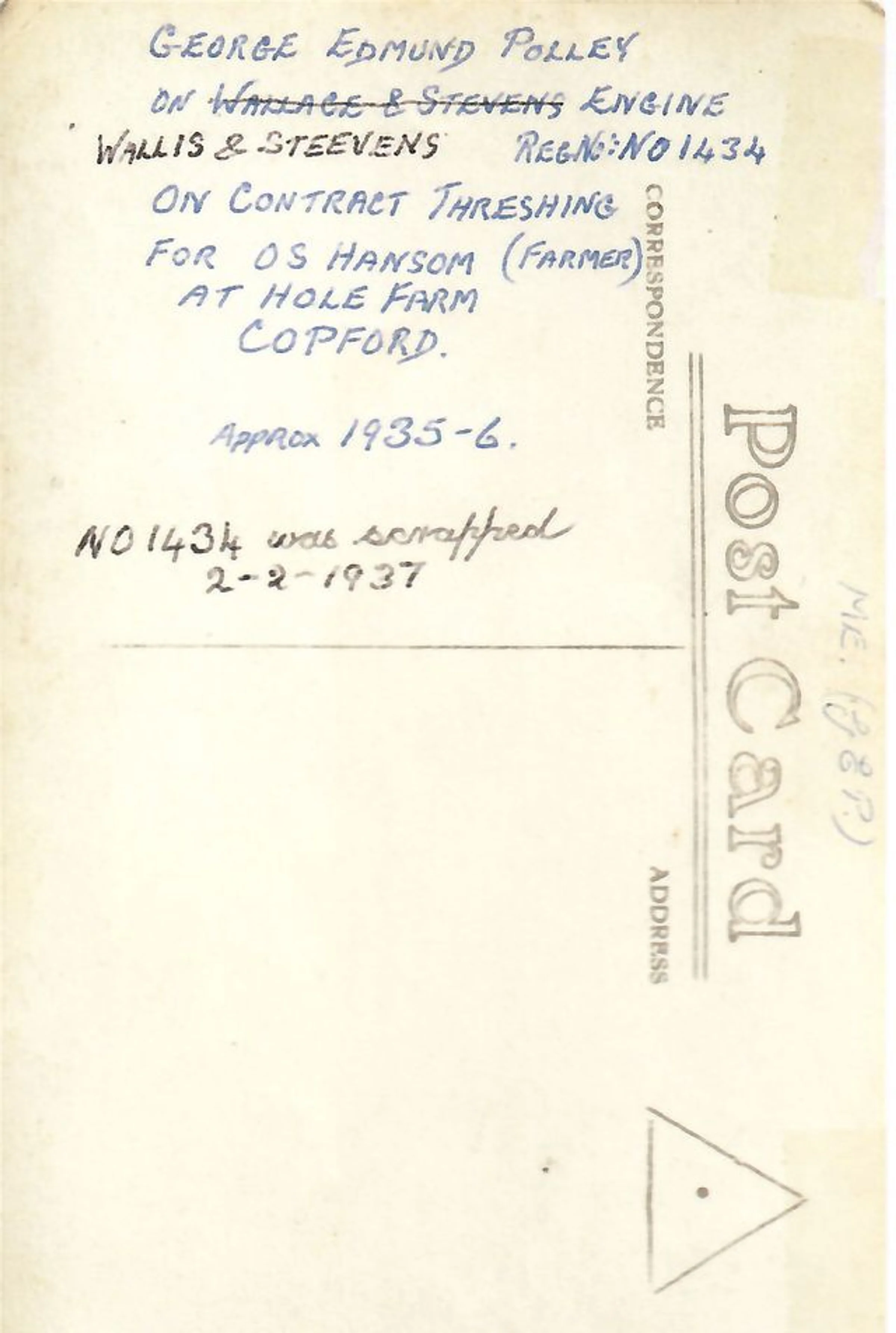 The reverse of a photo of George Polley on a Wallis & Steevens engine, registration number NO 1434 on contract threshing for O S Hansom, farmer at Hole Farm, Copford in 1935 or 1936.