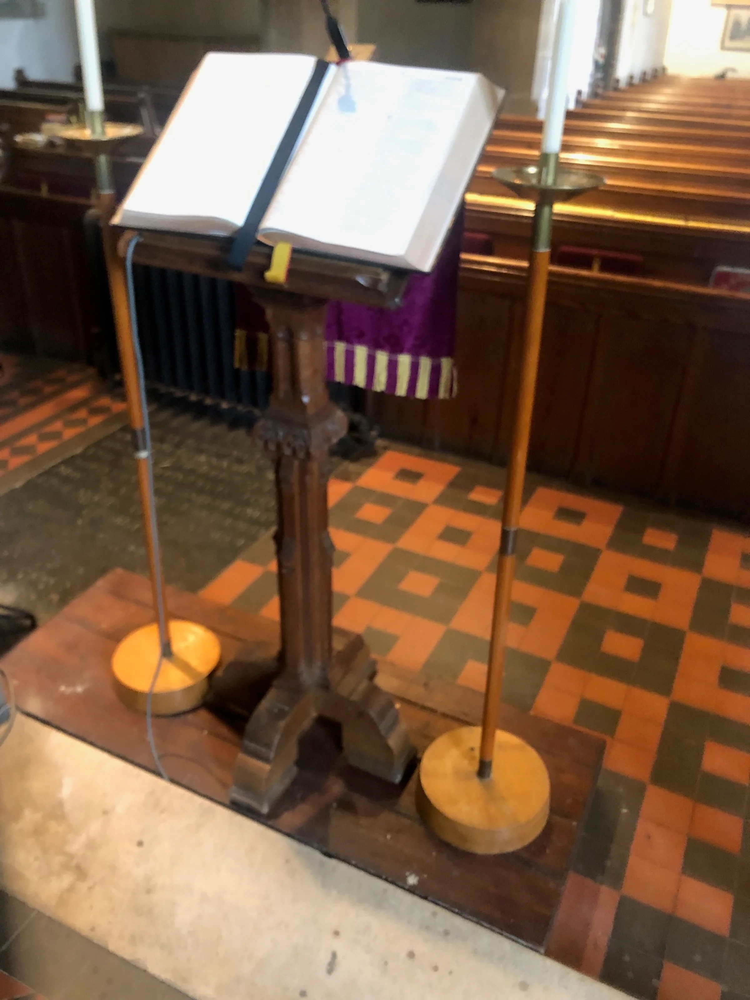 An undated but recent colour photo of the lectern carved by George Polley in position in St Albright's church, Stanway.