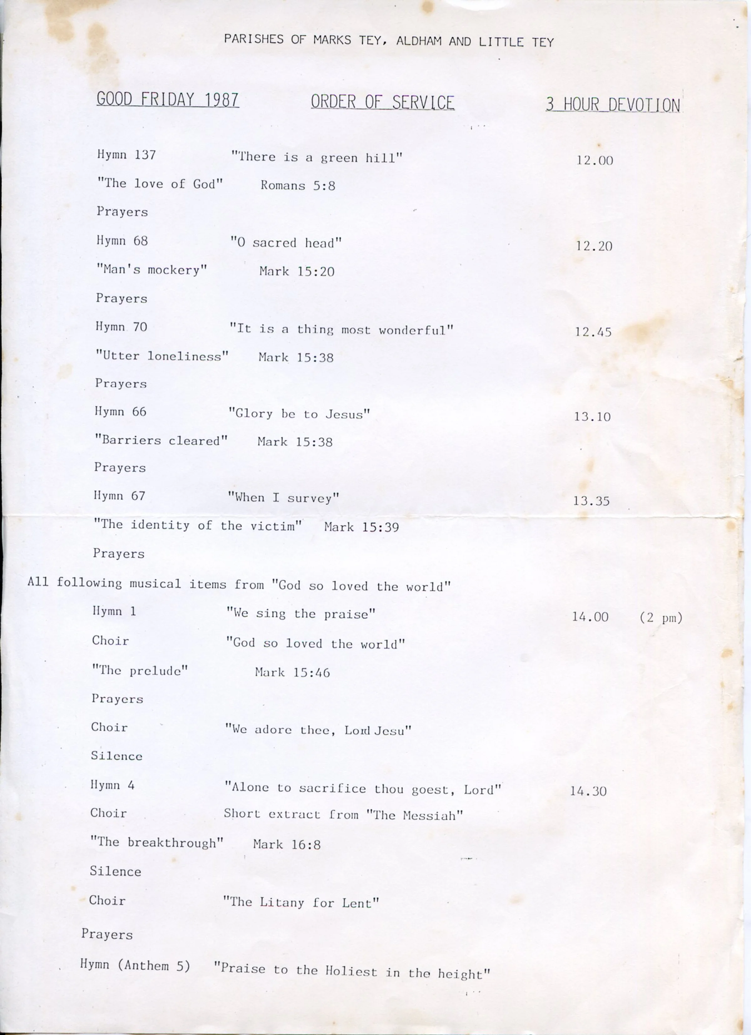 This service was held on Good Friday, 17 April 1987 at Little Tey church, for the parishes of Aldham, Marks Tey and Little Tey.