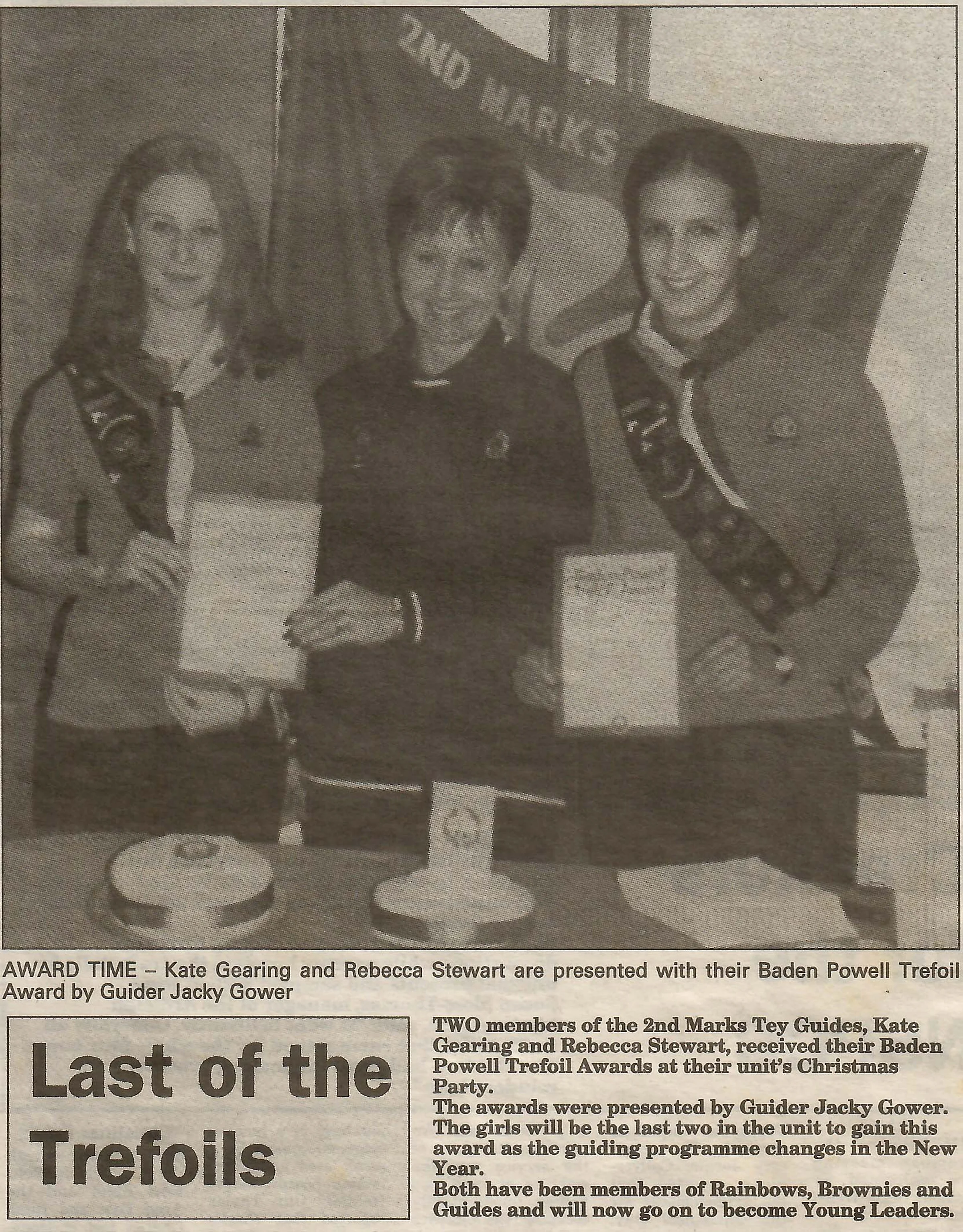 Newspaper photograph and report regarding two Guides receiving Trefoil awards.