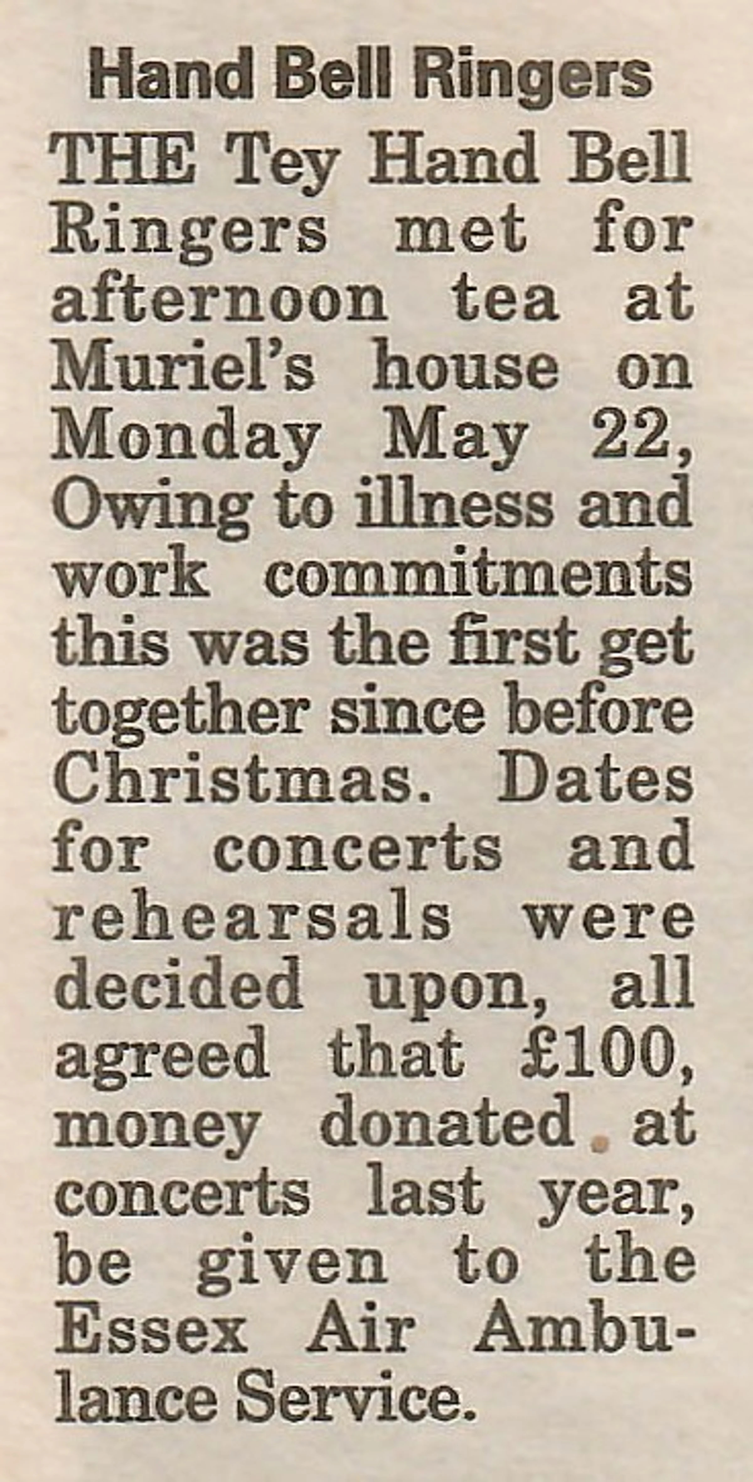 Village newspaper column reporting on the Tey Hand Bell Ringers.