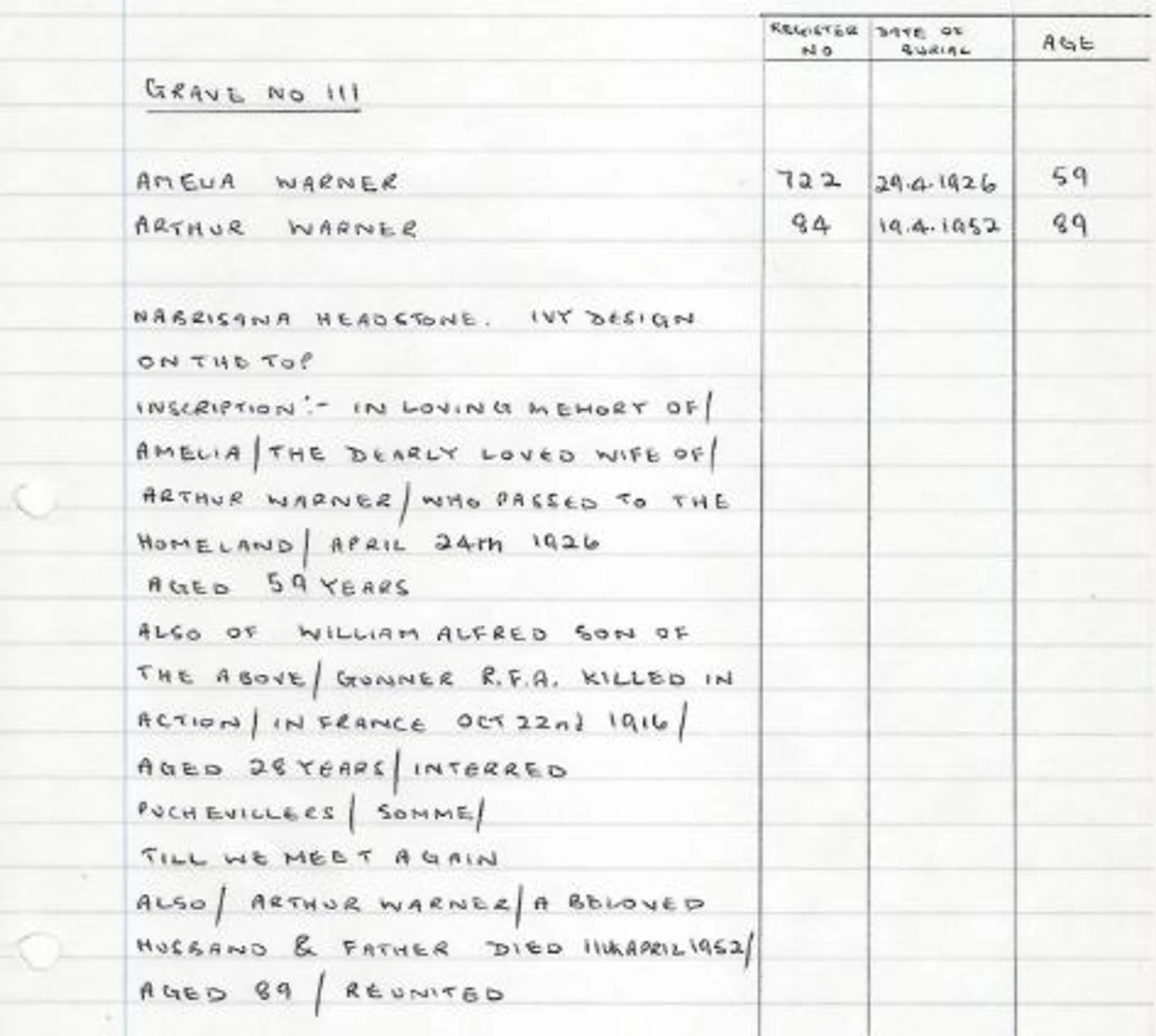 A handwritten record of the headstone for Grave 111 - Amelia Warner in 1926 and Arthur Warner in 1952.