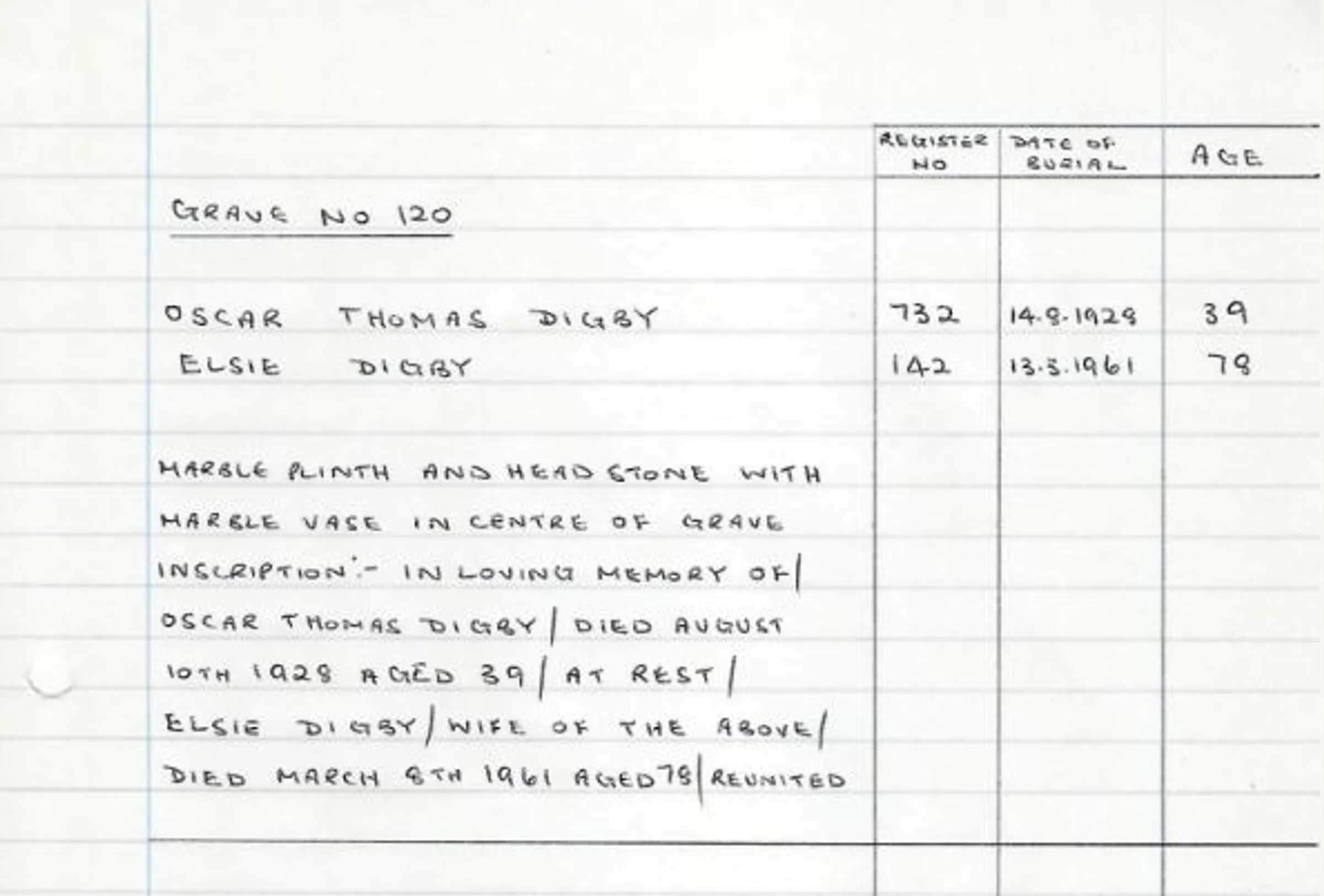 A handwritten record of the headstone for Grave 120 - Oscar Thomas Digby in 1928 and Elsie Digby, his wife, in 1961.